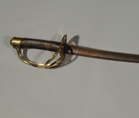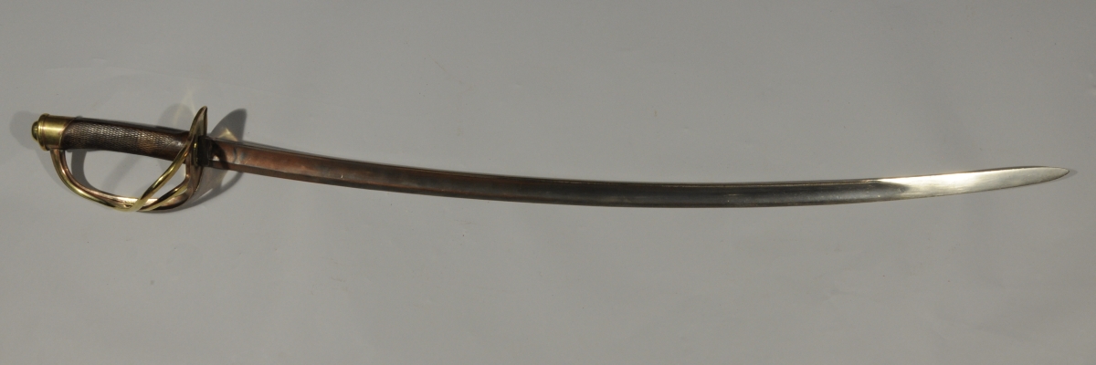 SABRE de cavalerie étranger, type 1822. Poignée en bois quadrillé. Monture en laiton, garde à trois branches poinçonné. Lame courbe à dos plat et pans creux.
