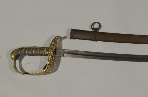 PRUSSE. SABRE d'officier. Poignée recouvert de galuchat avec filigrane. Monture en laiton, garde à une large branche ajourée et gravée de rinceaux feuillagées. Lame cintrée à pans creux gravée de rinceaux feuillagés et trophées d'armes. Fourreau en tôle de fer à un bracelet (oxydations).