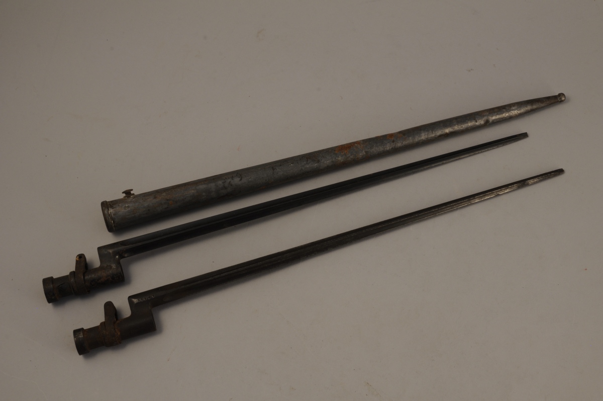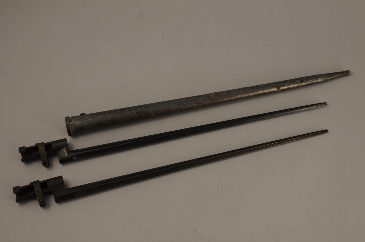 RUSSIE. DEUX BAÏONNETTES à douille MOSIN-NAGANT, modèle 91/30. Lame cruciforme avec marquages. L'une avec un fourreau en tôle de fer.