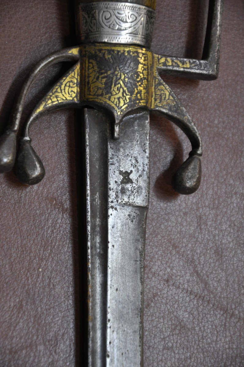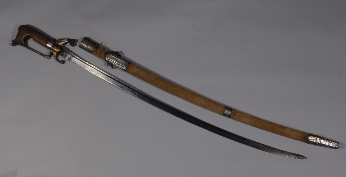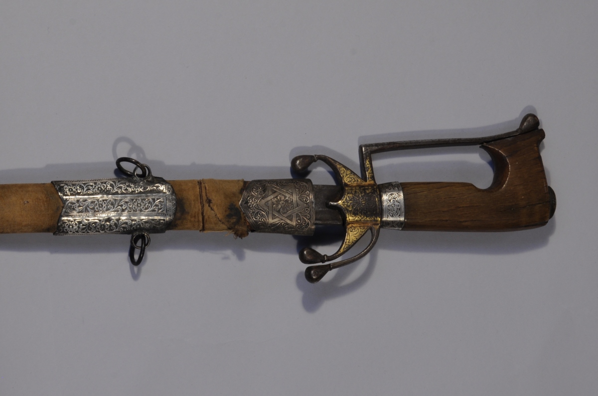 MAROC. SABRE dit NIMCHA. Poignée en corne à virole d'argent. Garde en fer forgé et doré à une branche et trois quillons recourbés vers le bas. Lame courbe à gouttière et dos plat, poinçonnée. Fourreau en bois recouvert de velours à garnitures d'argent ciselées de fleurs et rinceaux.