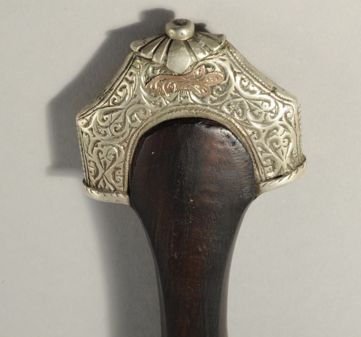 MAROC. POIGNARD en argent. Manche en bois noirci. Fourreau à arabesques, palmettes et trèfles. Lame métallique en partie gravée.