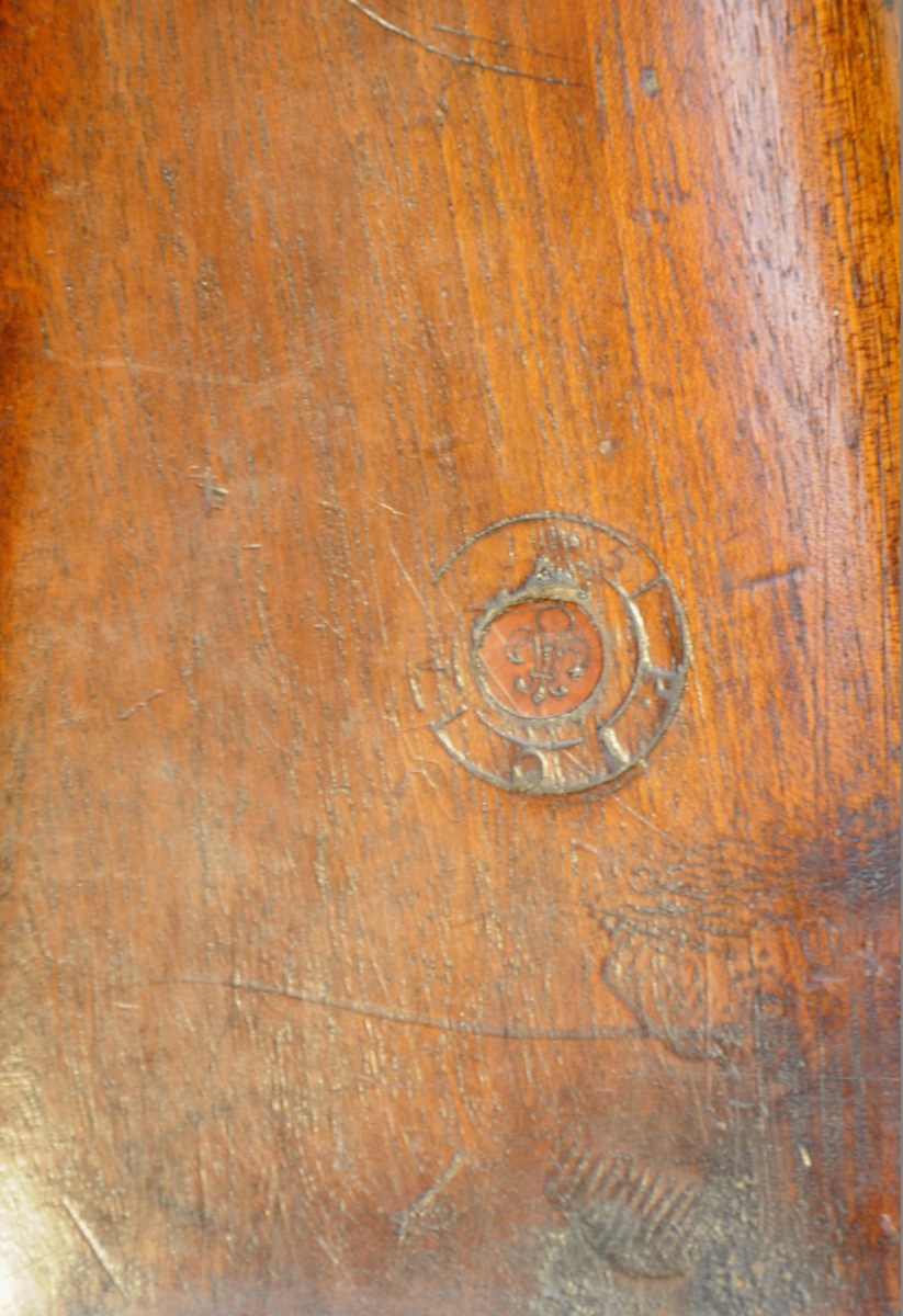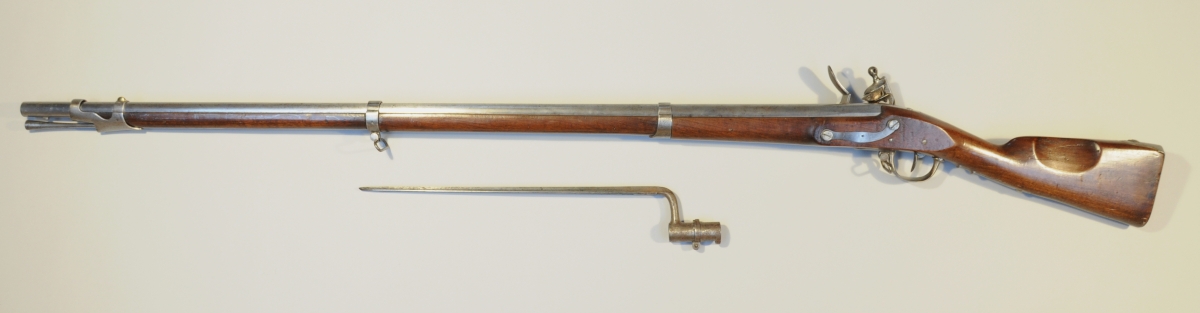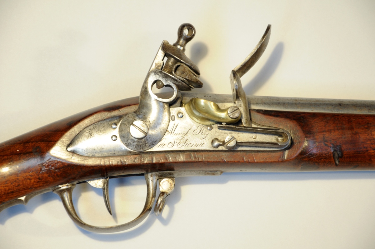 FUSIL à silex 1777 An IX et baïonnette. Platine Manuf Roy de St Etienne. Garnitures en fer. Cachet de crosse à la fleur de lys.