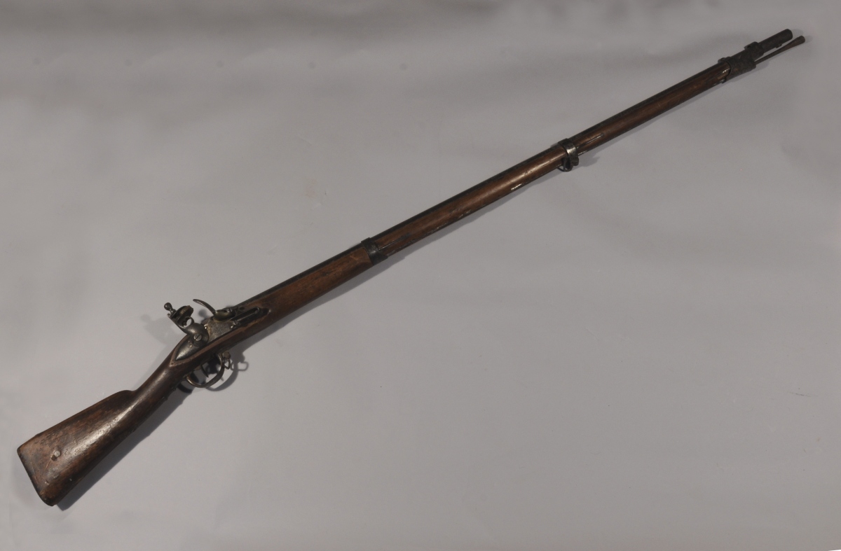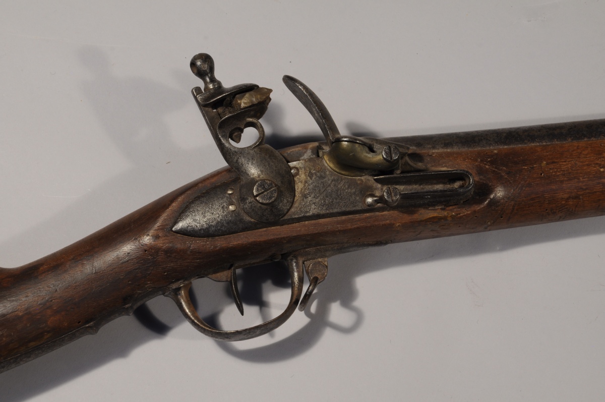 FUSIL à silex 1777 An IX. Platine Manuf Roy de St Etienne. Garnitures en fer. Cachet de crosse à la fleur de lys. Canon poinçonné et daté 1814 au tonnerre.