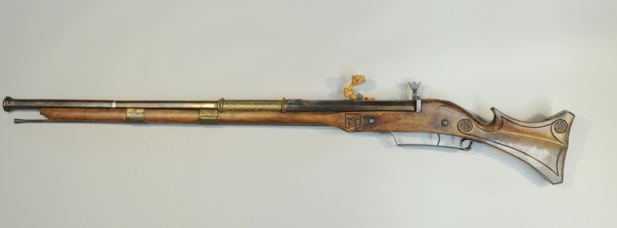 FUSIL À MÈCHE, canon à pans bagué de laiton. Crosse en bois clair gravé de rosaces et monogrammé "rr".
