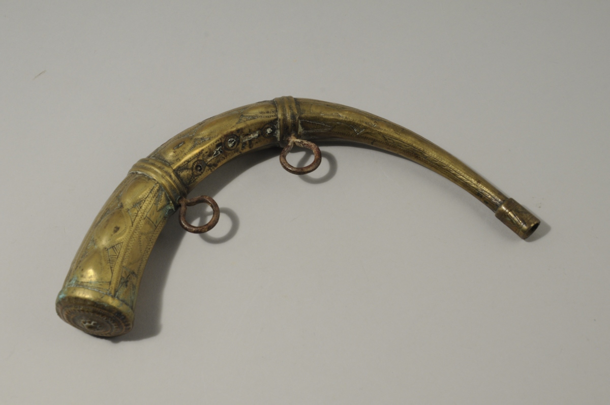 ORIENT. POIRE À POUDRE en laiton à frises d'olives et de fuseaux. Deux anneaux de fer.