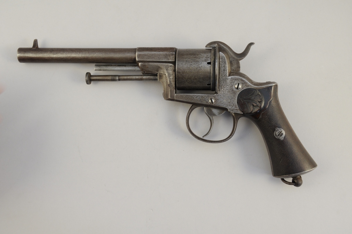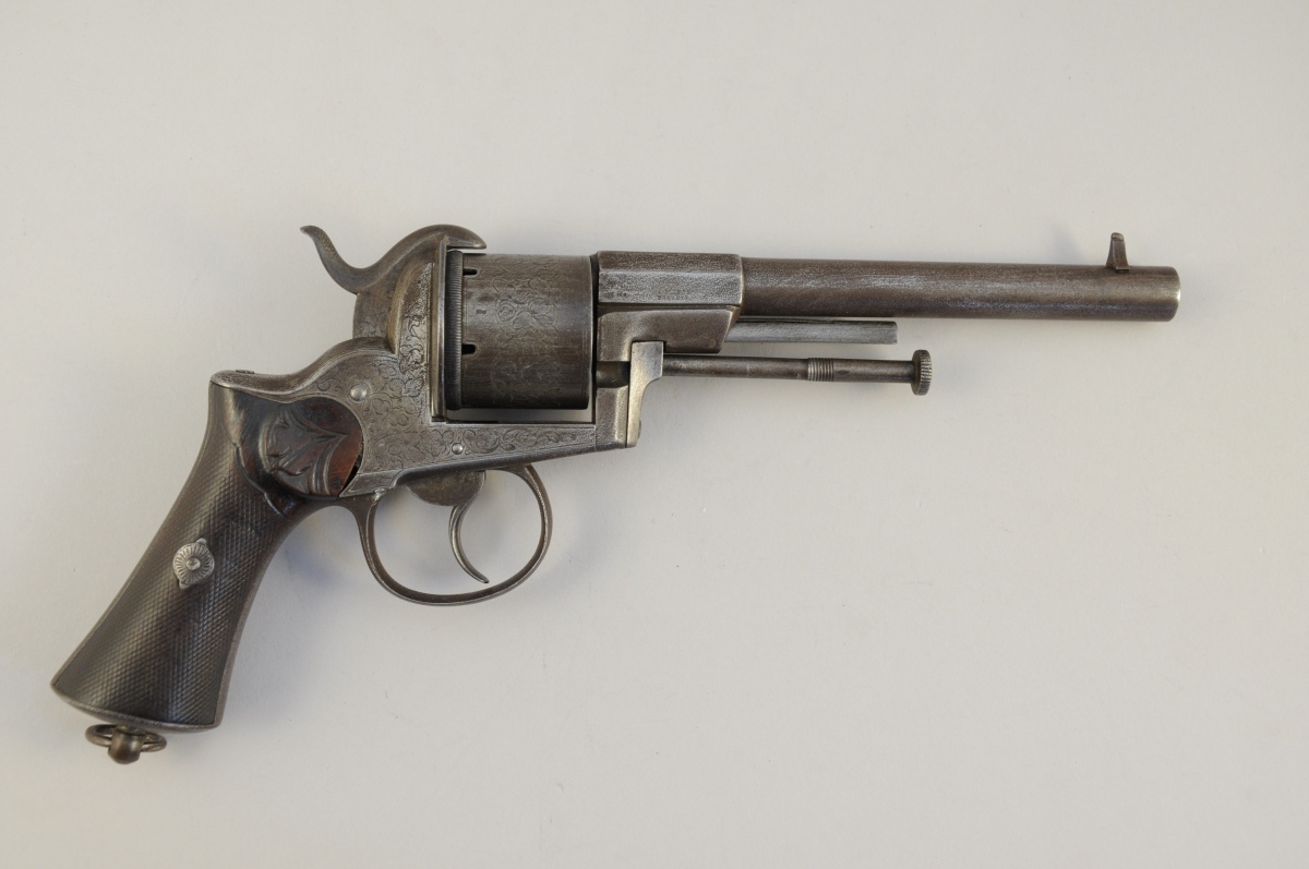 REVOLVER Pliers à broche, six coups. Canon rond à pans au tonnerre. Plaquettes de crosse en noyer sculpté.
