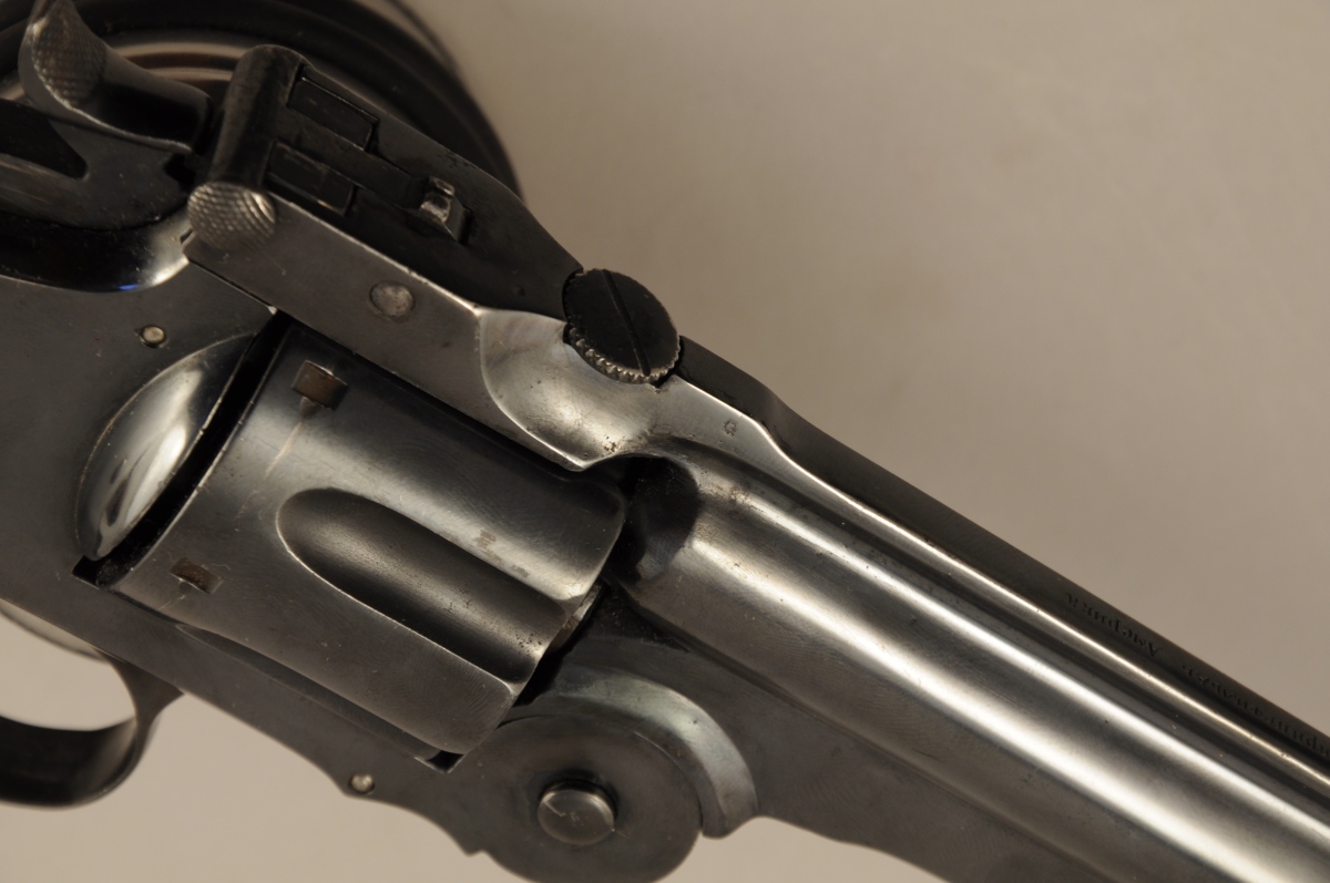 REVOLVER Smith & Wesson n°3 Russian, Third Model, contrat russe, six coups, calibre 44 Russian. Canon avec bande marquée en cyrillique. Finition rebronzée. (intérieur du canon piqué, une pièce à remonter)