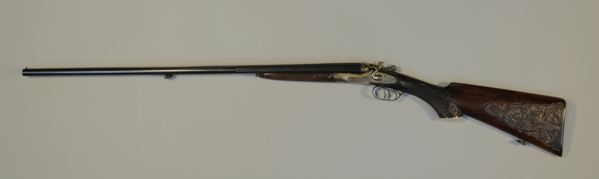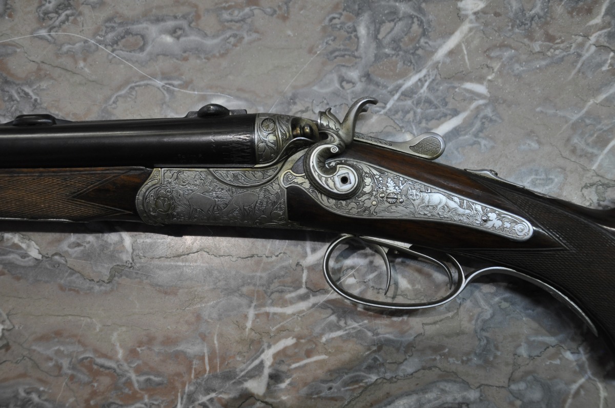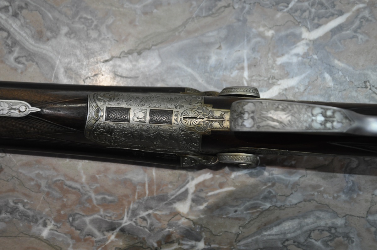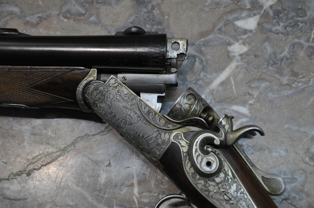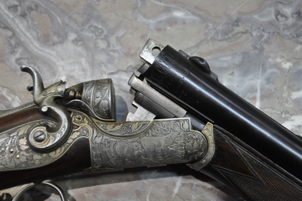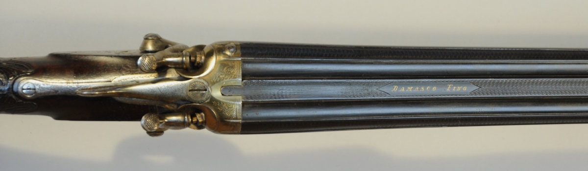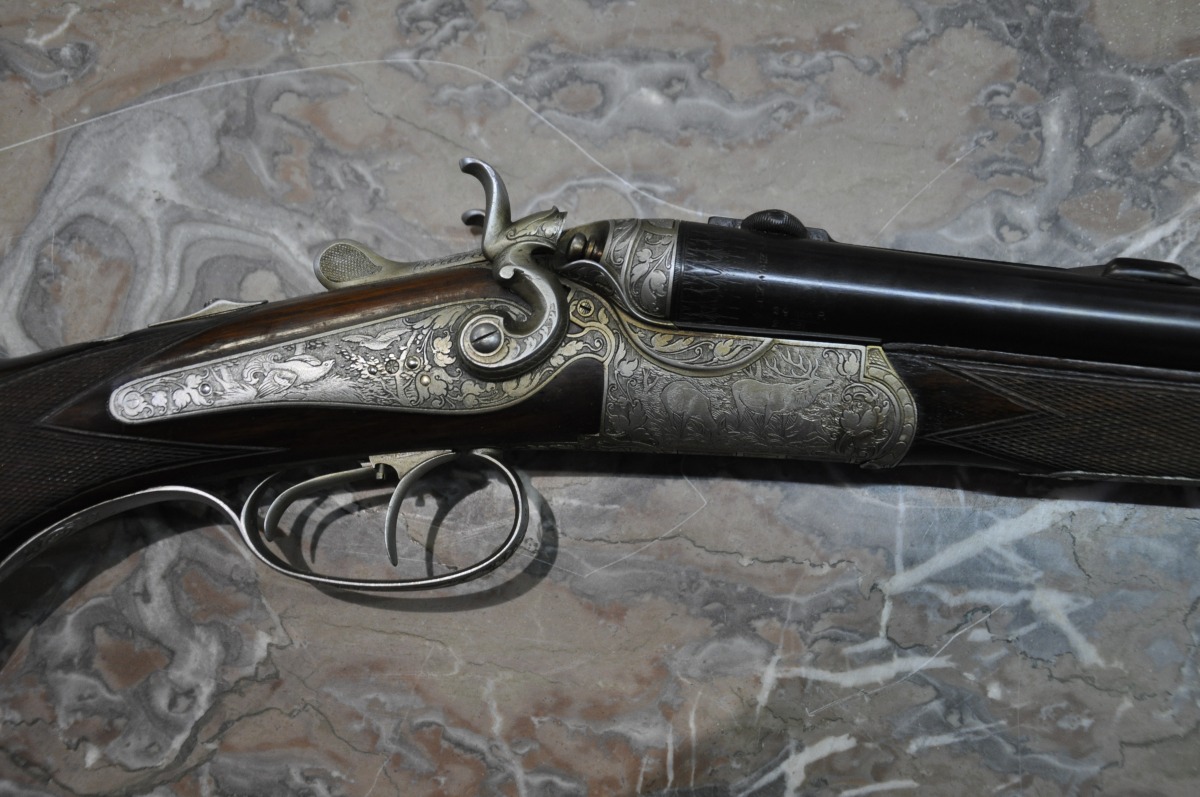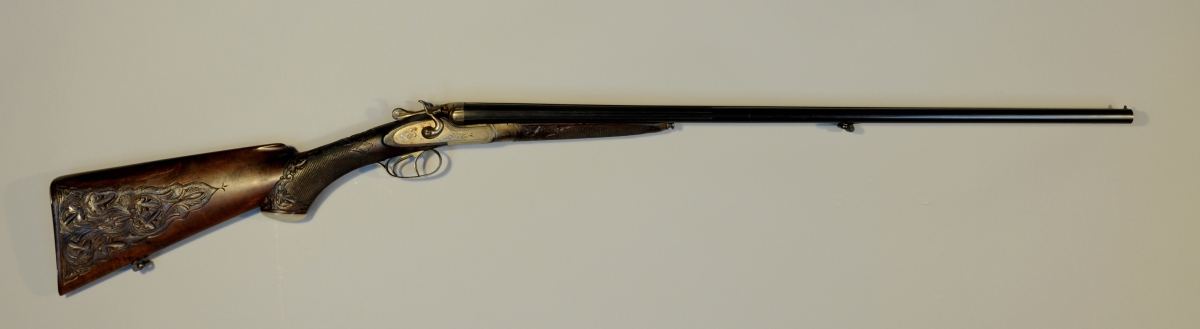 Canons juxtaposés marqués à l'or. Belle crosse en noyer sculpté de rinceaux feuillagés.