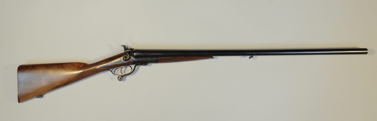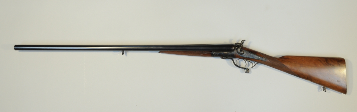 FUSIL DE CHASSE à percussion centrale, chiens extérieurs, HOLLAND-HOLLAND deux coups, calibre12. Canons juxtaposés (intérieur piqué). Platines arrières jaspées. Ouverture par clé sous pontet. Crosse en noyer.