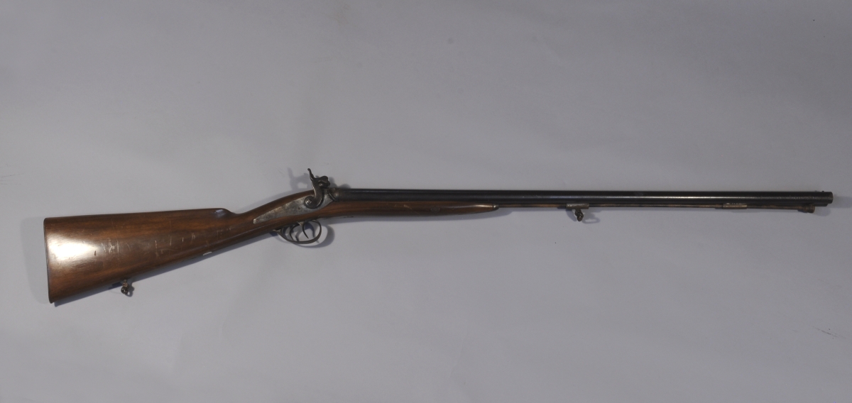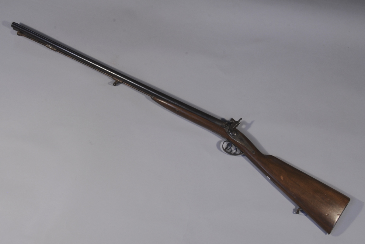 FUSIL DE CHASSE à percussion, deux coups à canons juxtaposés. Canons à l'imitation du damas. Crosse en noyer. Baguette.
