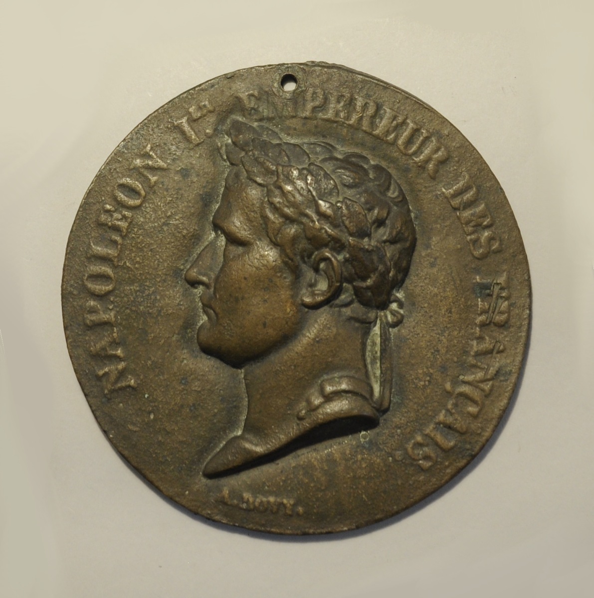 MÉDAILLON de forme ronde en bronze figurant NAPOLÉON Ier lauré en buste de profil. Titulature : Napoléon Ier Empereur des Français. Signé Bovy.