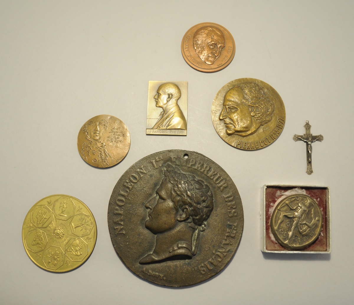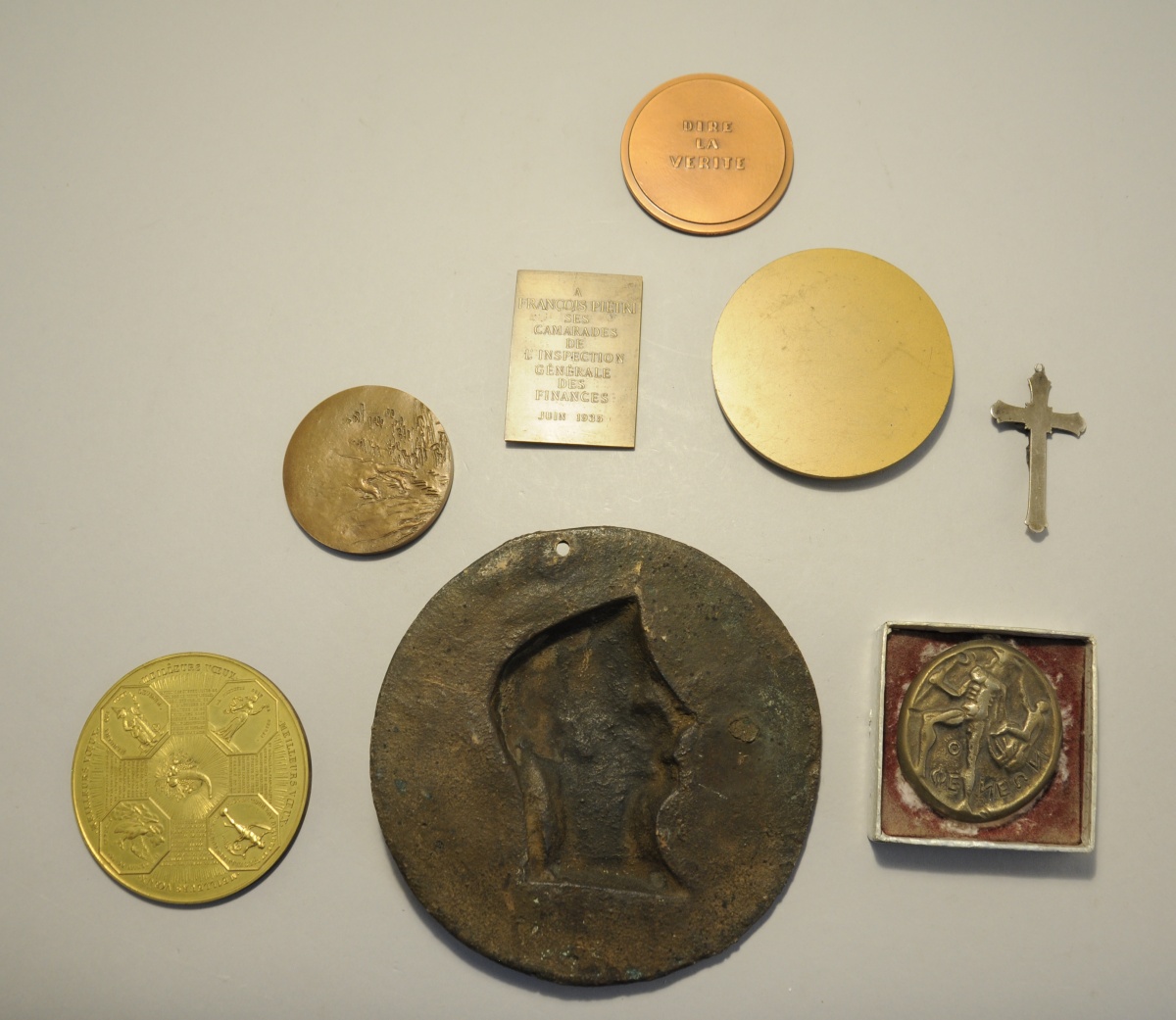 JOINT : SIX MÉDAILLES commémoratives et un crucifix. Matériaux et formats divers.