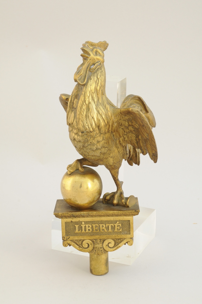 COQ DE DRAPEAU de la Garde nationale en bronze ciselé et doré, au coq hurlant. La patte droite posée sur un globe. Caisson à embase feuillagée marqué "Liberté" d'un côté et "Ordre . Public" de l'autre, sur fond amati. Douille ronde.