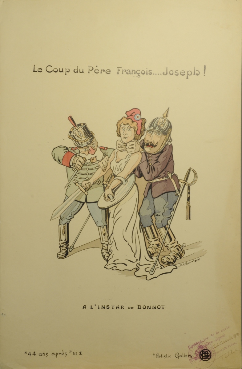 CARICATURES. 31 estampes, reproductions originales anciennes principalement en couleurs : graine de héros, mais hélas ce n'était qu'un rêve (2), une messe dans les ruines, mobilisation des détenus allemands, la "kultur" germanique, la reprise des affaires, banquet raté, nuit impériale, pages glorieuses, la tache de sang (4), les alliés en campagne, 1914 : Vive l'Angleterre- Paris- les assassins, le coup du Père François...Joseph ! (2), le clown rouge, Agen, sourires et coups de sabre : la navette(2)-la garde meurt...-et moi je me rends à Berlin-il l'a échappé belle ! (2). Jeu de la Victoire.