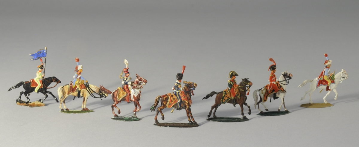 SOLDATS de PLOMB peints à la main. 16 pièces. Officiers à cheval et cavaliers de divers corps d'armée et pays (1 cassé).