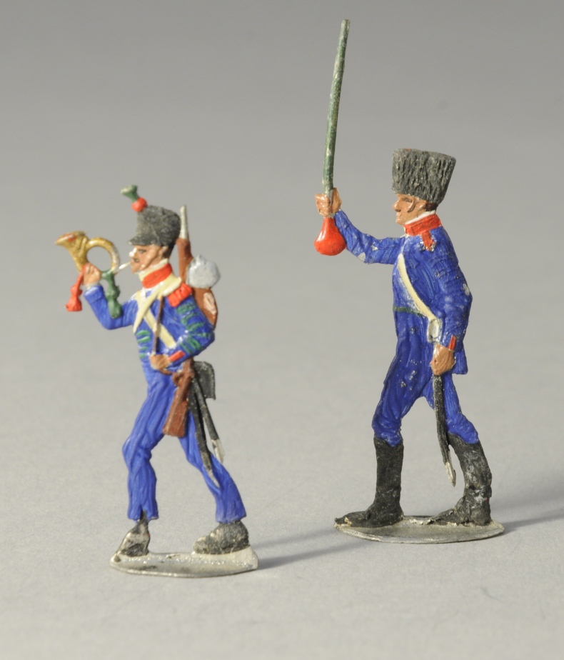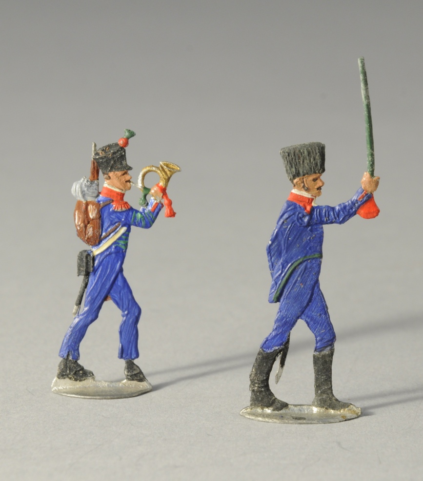 SOLDATS de PLOMB peints à la main. 14 pièces. Fanfare à uniforme bleu, rouge et vert.
