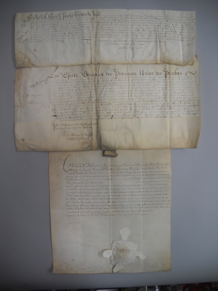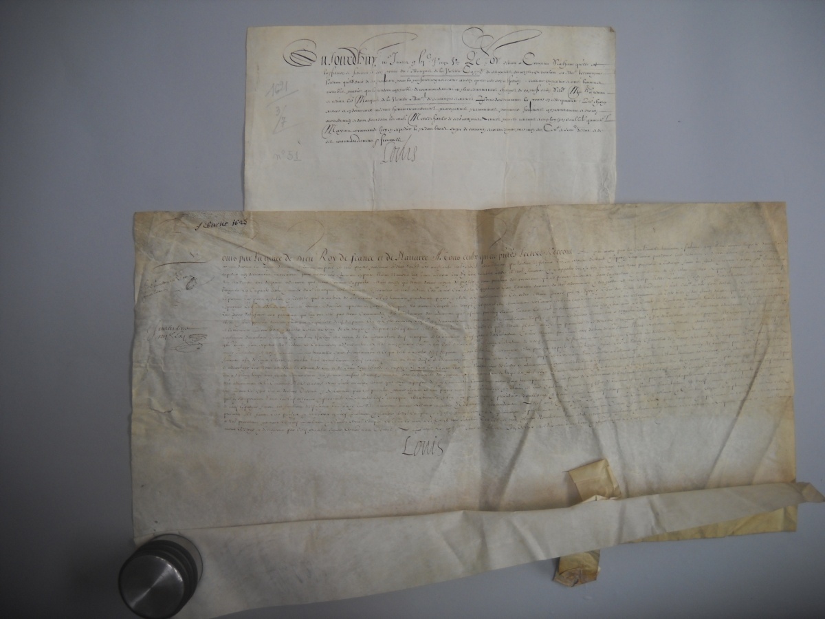 P.S., Cognac, 3 juillet 1621, signée " Louis " [Louis XIII roi de France (1601-1643)] et contresignée par le secrétaire d'état Brûlart, vélin. Brevet délivré à Charles de la Vieuville de maréchal de camp et armées du roi. - P.S., Paris, 11 février 1623, signée " Louis " [Louis XIII roi de France (1601-1643)] et contresignée par le secrétaire d'état de Loménie, vélin obl. in-plano. Lettres patentes du roi accordant la charge de surintendance des finances à Charles de la Vieuville, en remplacement du comte de Schomberg. - 2 pièces papier, 1632, relatives à la séparation de biens demandée par Marie Bouhier de Beaumarchais, épouse du marquis de la Vieuville, " voyant l'état de la perte et destruction de la fortune " de son mari exilé. - P.S., septembre 1638, signée " Carolus Rex " [Charles Ier, roi d'Angleterre (1600-1649)], cachet sec aux armes d'Angleterre, vélin. Lettres de sauvegarde en blanc pour circuler librement dans les pays au-delà de la mer. - 2 P.S., octobre 1641, sur vélin, commission délivrée par les états généraux des Provinces Unies des Pays-Bas et par Frédéric-Henri d'Orange-Nassau en faveur du marquis de la Vieuville lui donnant le commandement d'une compagnie de cavalerie de leurs troupes, vacante par la démission du duc de Bouillon.