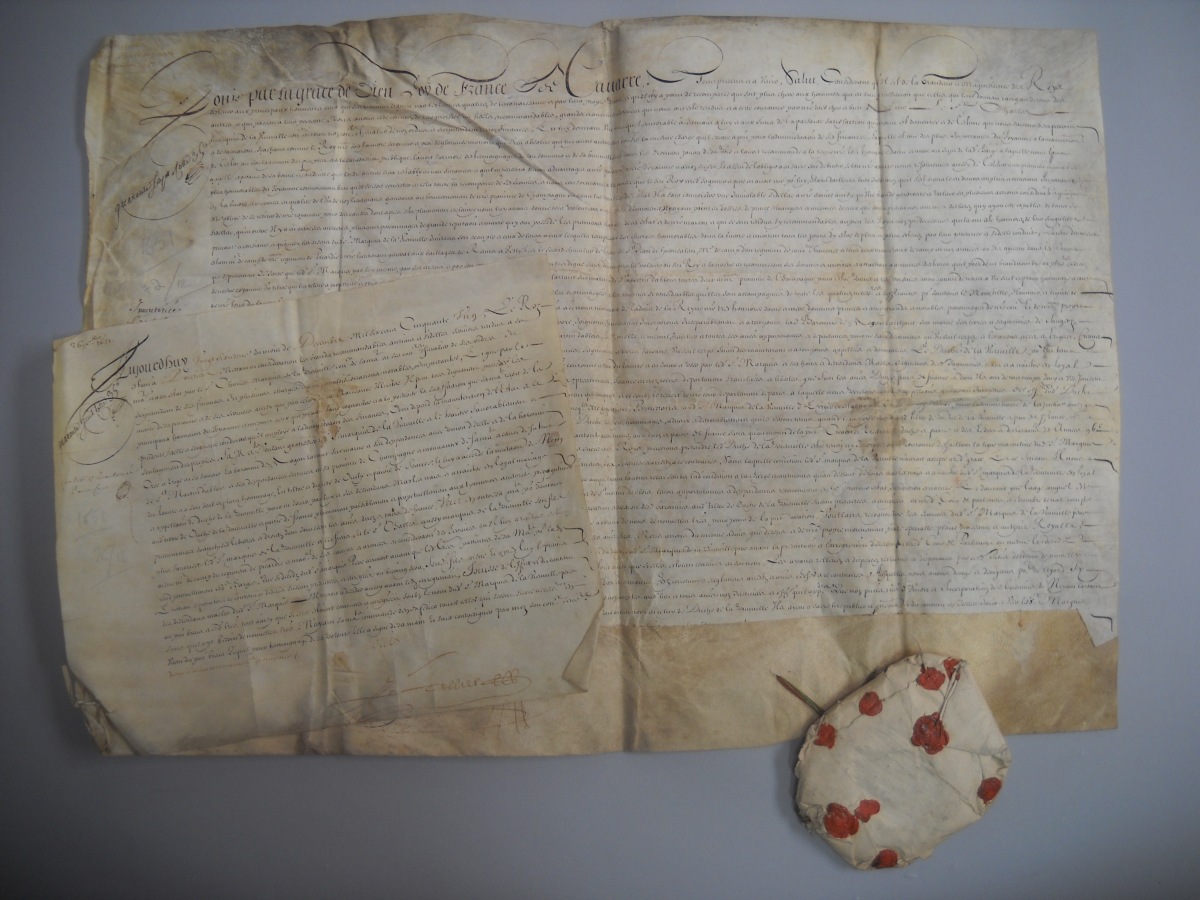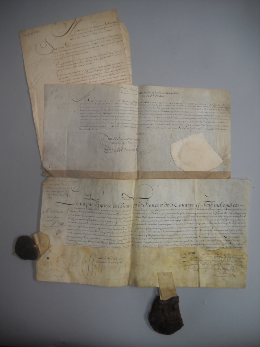 9 pièces, parchemin et papier, 1643, dont 2 P.S. signées " Louis " [Louis XIV roi de France (1638-1715)], rétablissant Charles de la Vieuville en tous ses biens, droits, honneurs, charges et dignités tels qu'ils les possédaient avant son arrestation et persécution de ses ennemis ; rétablissement en ses honneurs et privilèges de chevalier de l'Ordre du Saint Esprit dont il avait été exclu par arrêt du chapitre de l'Ordre. - P.S., Paris, 8 avril 1644, signée " Louis " [Louis XIV roi de France (1638-1715)] et contresignée par de Loménie, vélin obl., reste de sceau de cire jaune, rétablissant le marquis de Vieuville en sa charge de lieutenant général du roi au gouvernement de Champagne. - 7 P.S., 1644, 1645 et 1649, parchemin et papier, dont 5 signées " Louis " [Louis XIV roi de France (1638-1715)], contresceaux sous papier, donnant autorisation au marquis de la Vieuville de remettre le collier de l'Ordre de Saint Michel au sieur de Prulay,à Nicolas Desjardins sieur de La Motte, et à Claude Gislain sieur de Saint Marc.- P.S., Paris, 20 mai 1650, signée " Louis " [Louis XIV roi de France (1638-1715)] et contresignée par [Henri du Plessis] de Guénégaud, vélin obl. plié, beau grand sceau et contresceau de cire jaune aux armes de France. Lettres patentes du roi au profit du marquis de la Vieuville pour le faire jouir de l'entier profit de ses lettres de rétablissement du 6 juin 1643 en cassant et annulant tous jugements et procédures faites contre lui pendant son absence du royaume et annulant toute prescription qui pourrait lui être opposée. - 2 P.S., Paris, 9 septembre 1651, signée " Louis " [Louis XIV roi de France (1638-1715)] et contresignée par [Henri du Plessis] de Guénégaud, vélin obl., superbe grand sceau de cire jaune. Brevet accordé à Charles de la Vieuville de prendre séance aux conseils du roi au-dessus de tous les plus anciens conseillers d'état été immédiatement après les grands officiers de la Couronne. - P.S., Fontainebleau, 30 septembre 1651, signée " Louis " [Louis XIV roi de France (1638-1715)] et contresignée par [Henri du Plessis] de Guénégaud, vélin. Lettres patentes du roi accordant le titre et la qualité de conseiller honoraire dans toutes les compagnies souveraines du royaume de France. - P.S., Poitiers, décembre 1651, signée " Louis " [Louis XIV roi de France (1638-1715)] et contresignée par le secrétaire d'état [Michel] Le Tellier, vélin obl. in-plano plié, scellé du grand sceau de cire verte enveloppé dans une gaine de papier cacheté aux armes de la Vieuville, tenu par un cordonnet de soie rouge et verte. Lettres patentes du roi autorisant l'érection en duché-pairie de la baronnie de Nogent l'Artaud et d'Ablois, en Champagne ; joint arrêt d'enregistrement par le parlement et affiche imprimée.