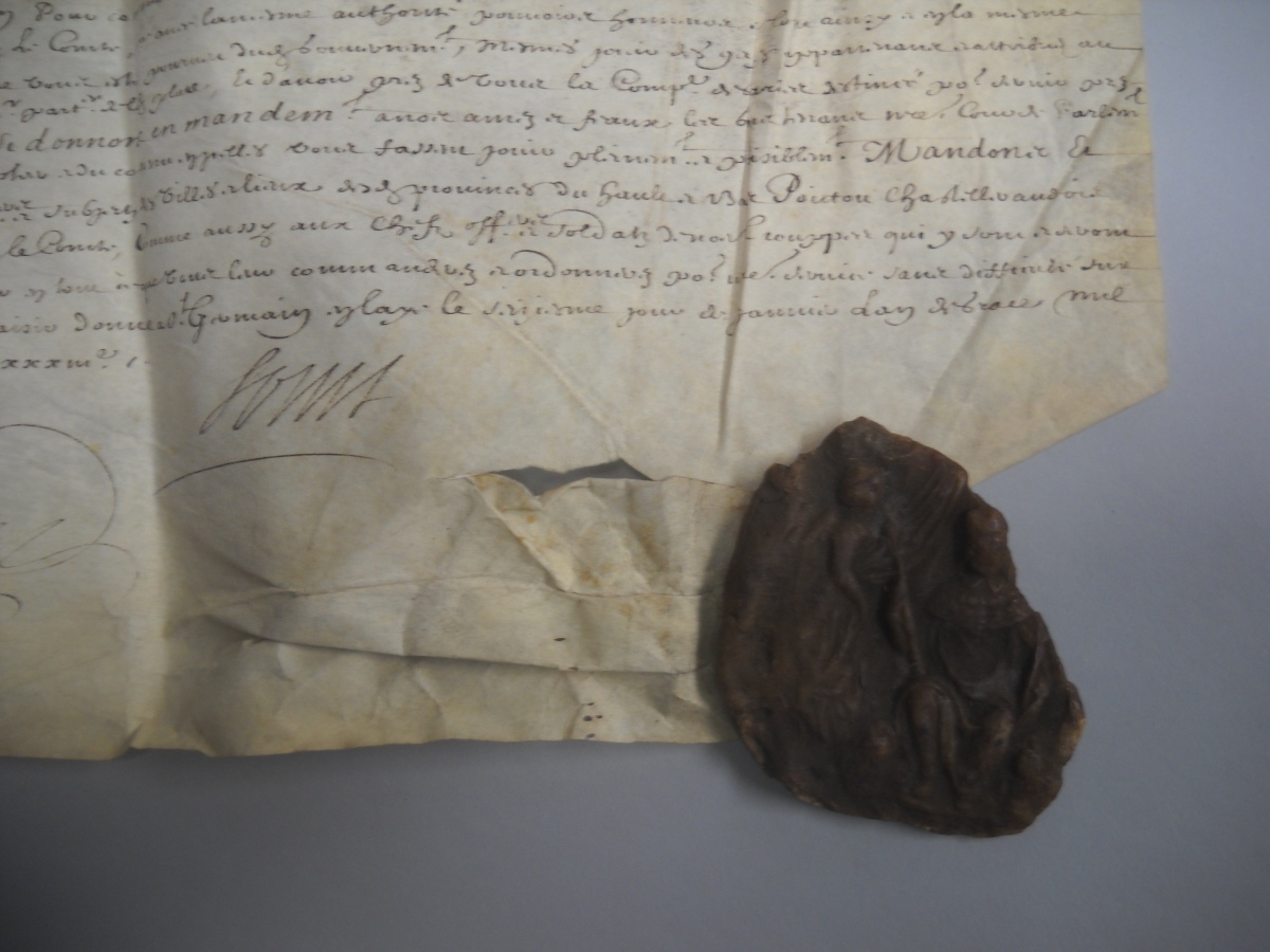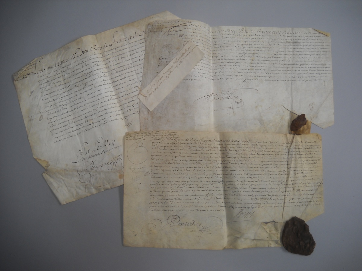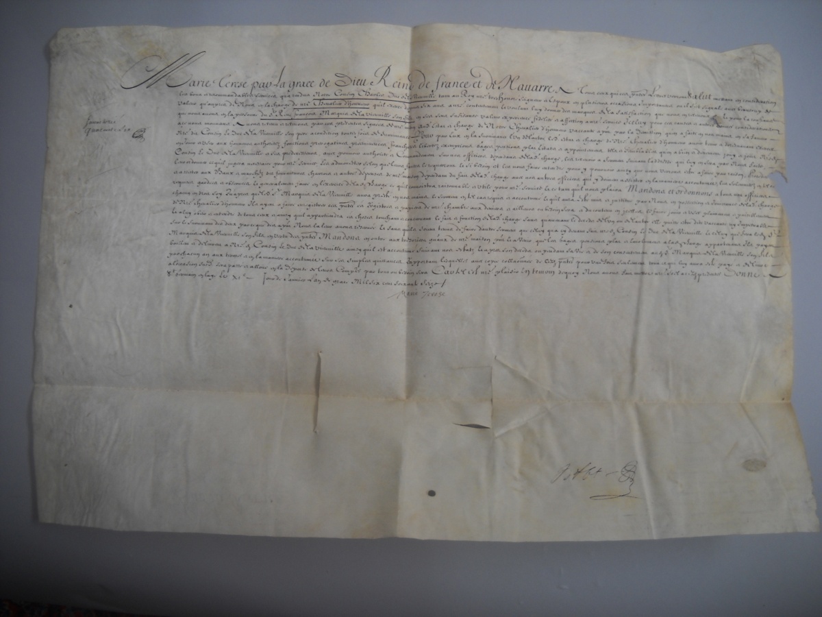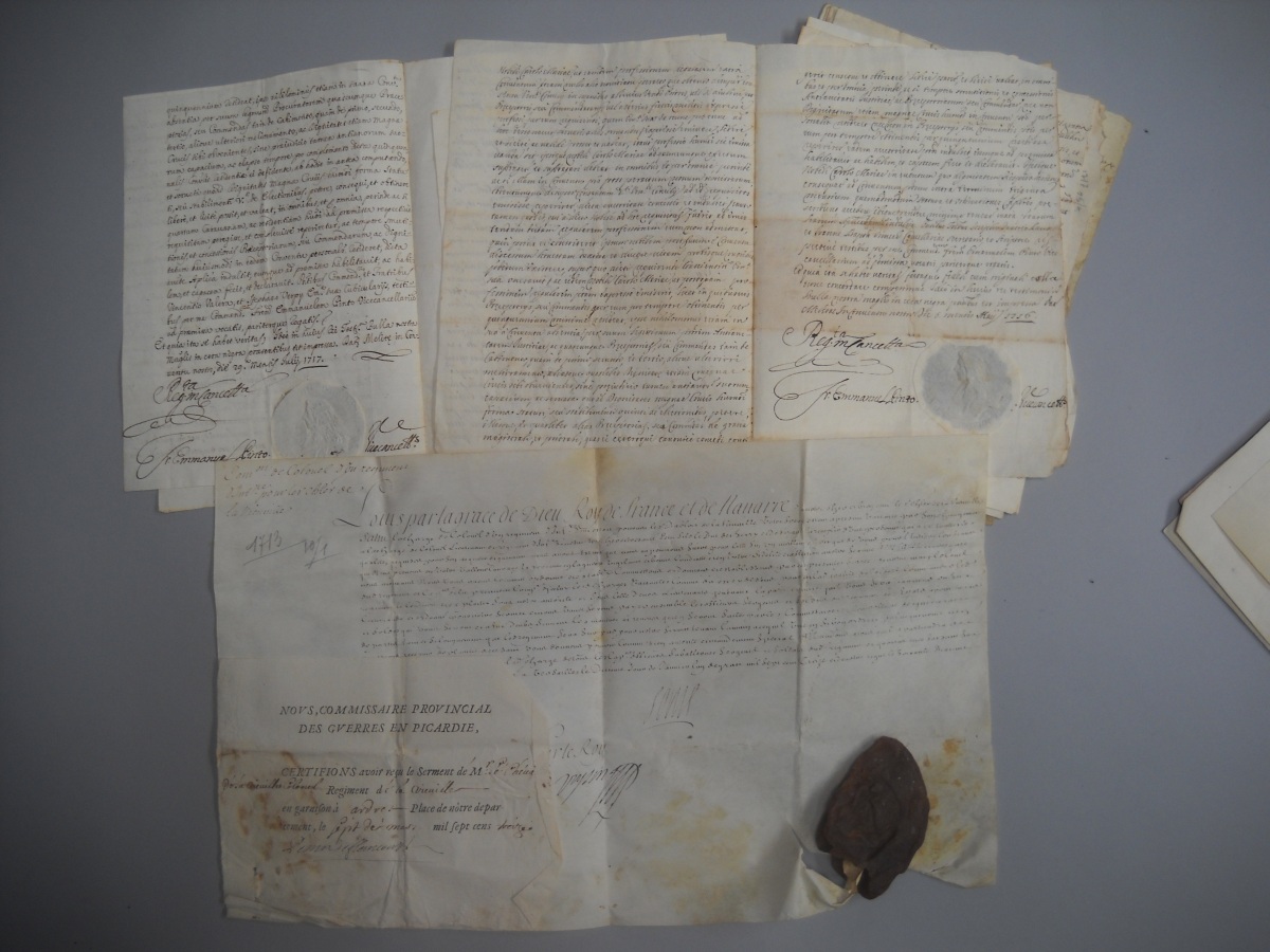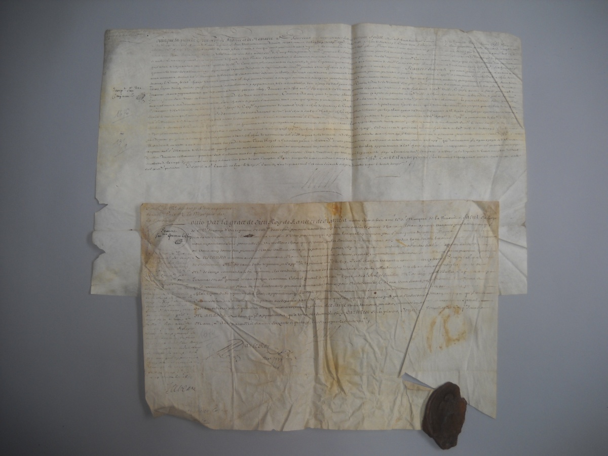 P.S., Versailles, 5 mars 1674, signée " Louis " [Louis XIV roi de France (1638-1715)] et contresignée par le secrétaire d'état Le Tellier [de Louvois], et par le vicomte de Turenne, général des camps et armées du roi et colonel général des cavaleries légères, vélin obl., reste de sceau de cire jaune. Commission de mestre de camp d'un régiment de cavalerie délivré à René François marquis de la Vieuville. - P.S., 11 janvier 1676, signée " Marie Thérèse " [Marie Thérèse d'Autriche reine de France (1638-1683)], vélin obl. Provisions de chevalier d'honneur données à titre de survivance par la reine à René-François marquis de la Vieuville, succédant à son père. - 3 P.S., Saint Germain en Laye, 13 et 16 janvier 1676, signées " Louis " [Louis XIV roi de France (1638-1715)] et contresignée pars par le secrétaire d'état Le Tellier [de Louvois], vélin obl., dont une avec reste de grand sceau de cire jaune. Provisions de gouverneur du Haut et du Bas Poitou et celle du gouvernorat de la ville et château de Fontenay le Comte, délivrées à René François de la Vieuville sur démission du duc de la Vieuville son père ; joint 5 pièces sur parchemin - P.S., Saint Germain en Laye, 17 février 1677, signée " Louis " [Louis XIV roi de France (1638-1715)] et contresignée par le secrétaire d'état Le Tellier [de Louvois], vélin obl., reste de sceau de cire jaune. Commission de colonel du régiment Navarre délivrée à René François de la Vieuville. - P.S., Paris, 29 avril 1717, signée " Louis " [Louis XV roi de France (1710-1774)] et contresignée par de Phélypeaux en présence du duc d'Orléans régent, vélin obl. Lettres de survivance de la charge de gouverneur du Haut et du Bas Poitou. - 8 copies de brefs de pensions et de dispenses délivrées par les grands maîtres de l'Ordre des Hospitaliers de Saint Jean de Jérusalem à Charles Louis Marie de la Vieuville, chevalier de Malte et fils de René François, 1695-1717 - P.S., Versailles, 10 janvier 1713, signée " Louis " [Louis XIV roi de France (1638-1715)] et contresignée par Voisin, vélin obl., reste de grand sceau de cire jaune. Commission de colonel d'un régiment d'infanterie délivrée à Charles Marie de la Vieuville. - 4 P.S., 1719, 1731 et 1733, vélin et papier, signées " Louis " [Louis XV roi de France (1710-1774)]. Brevet de la charge de guidon de la compagnie des gendarmes de monseigneur le dauphin ; brevet de la charge d'enseigne en la même compagnie ; brevet de la charge de sous-lieutenant en la compagnie des gendarmes Bourguignons ; brevet de la charge de mestre de camp en la même compagnie.
