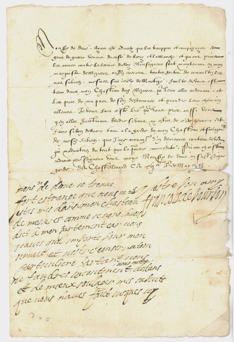 Partie autographe du duc : " Monsgr de Doné je trouve fort estrange que nous ne vous estes mis dans mon chasteau de Mesières comme je vous l'avois dict à mon partement car vous scaves qu'il importe pour mon service et nostre conservation particulière partant vous ne faudres incontinent vous mettre dedans et de mieux soulager mes subjects que vous n'aves faict jusques icy. Vostre bon amy François de Bourbon "