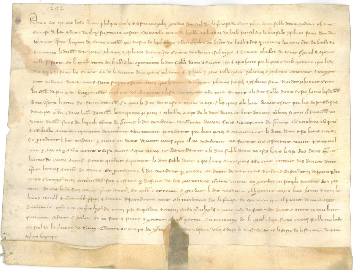 - Acte notarié passé en la prévôté de Gien, sur parchemin, daté de 1292, contrat d'échange et de vente de terres entre la comtesse de Bar et de Torcy, et la famille de Bailli.