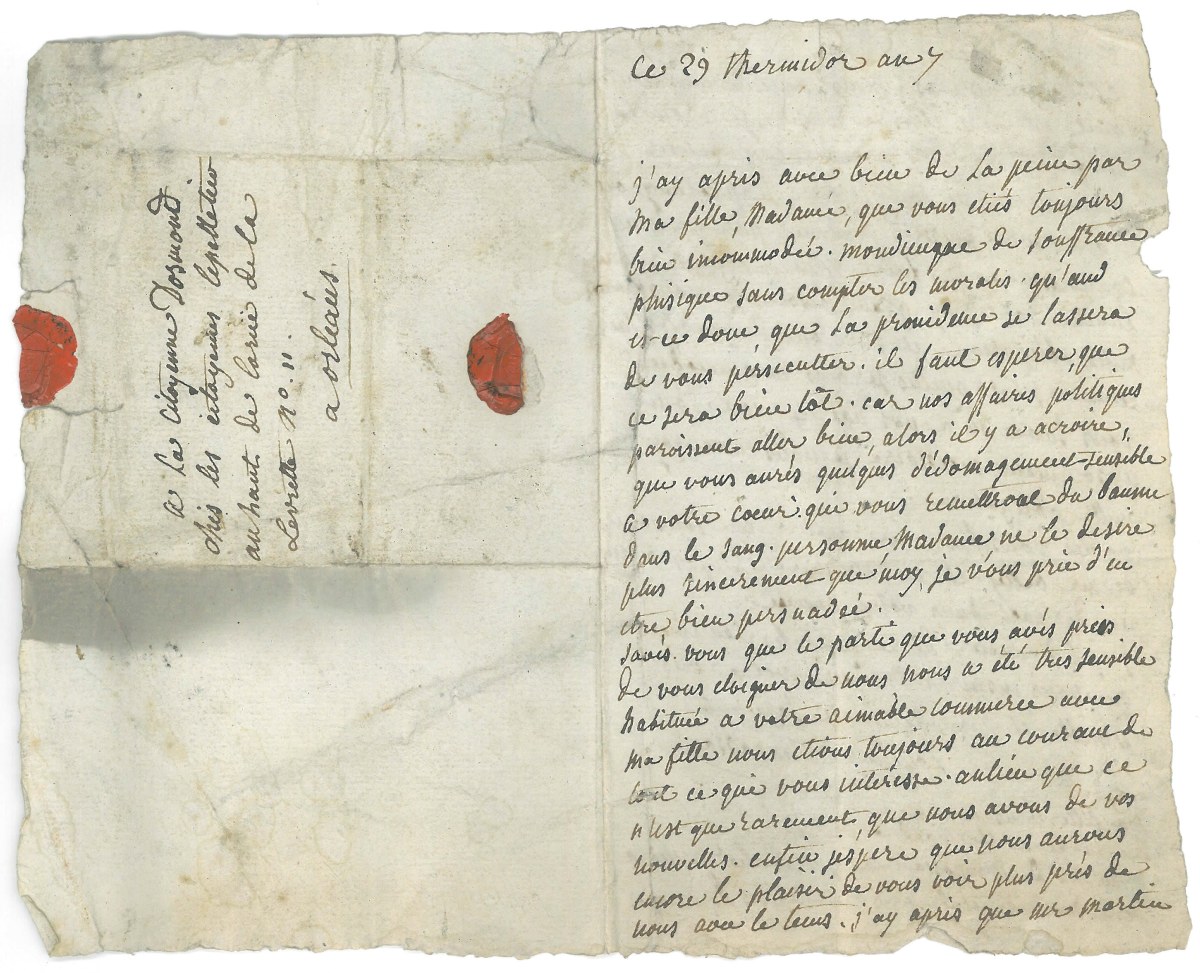 - L.A.S. d'Émérance-Jacqueline Le Louchier, épouse de Jean-François de Maupassant, noble orléanais et commissaire ordonnateur des guerres, 29 thermidor an VII (16 août 1799), adresse, 2 pages in-8