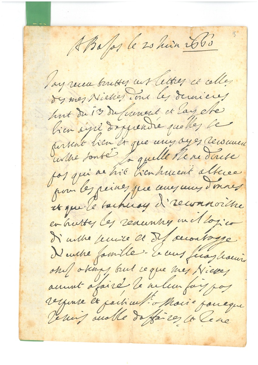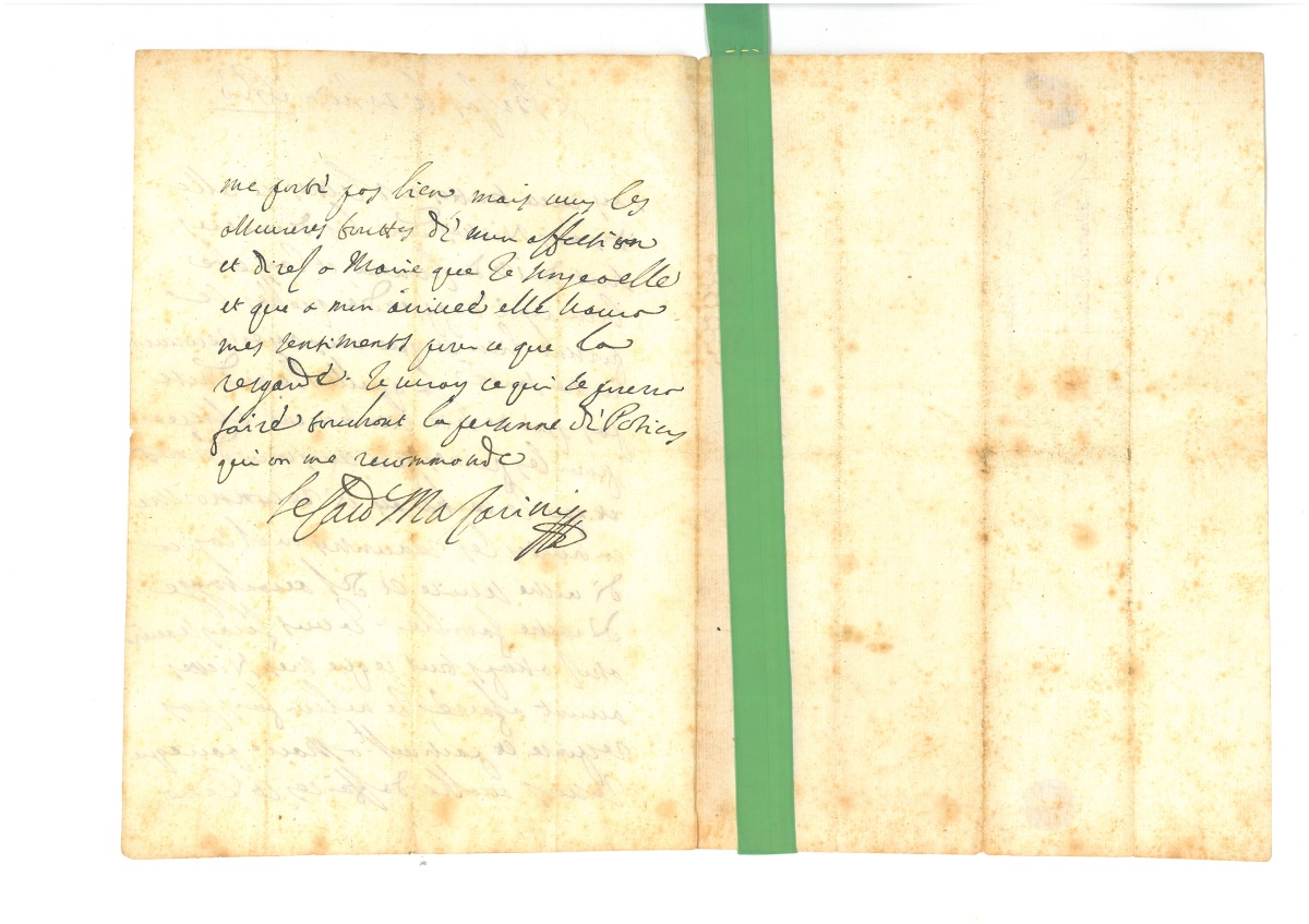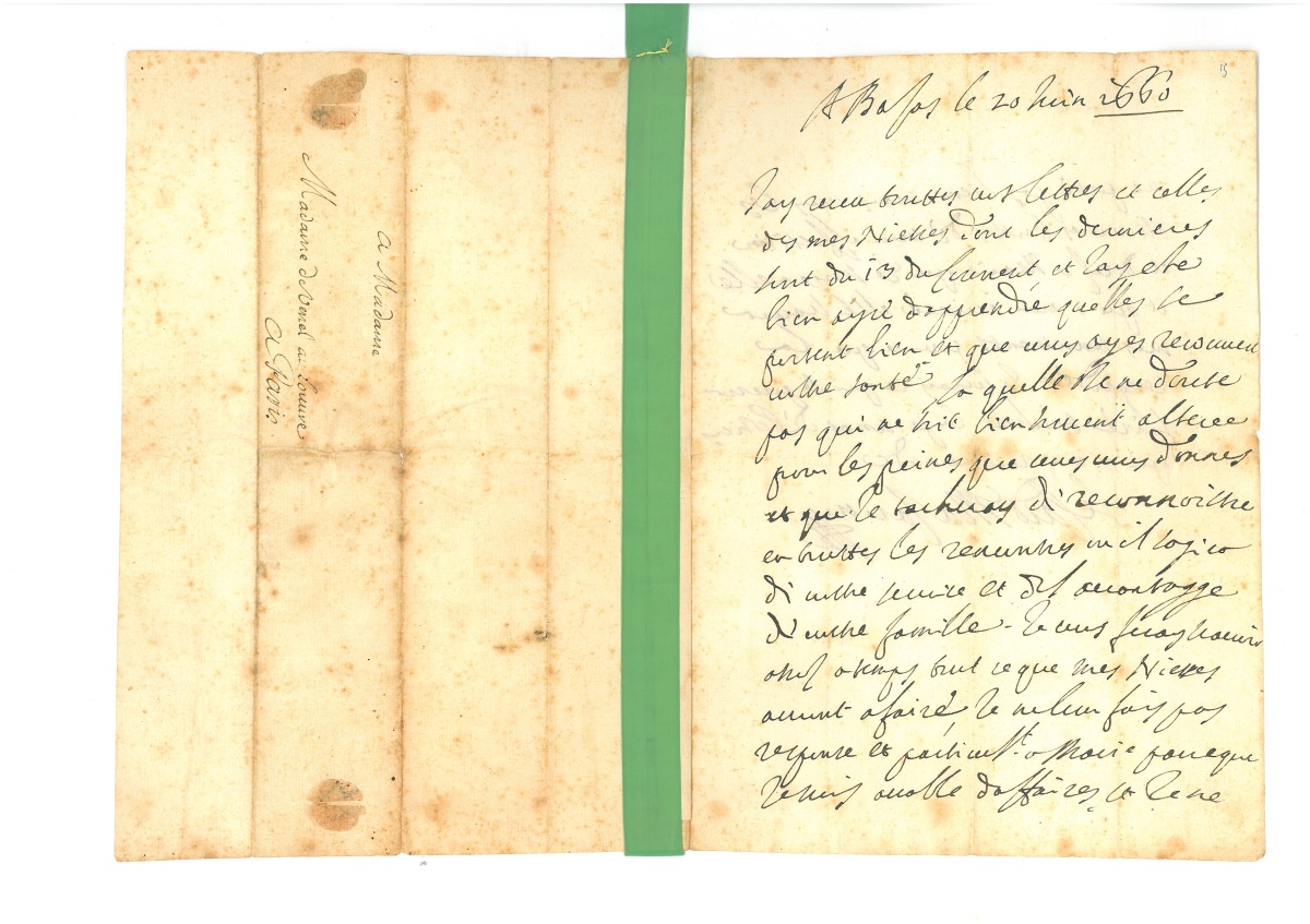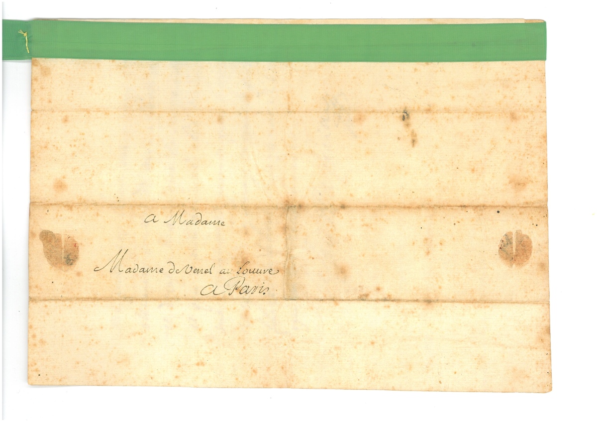 À LA GOUVERNANTE DE SES NIECES. Il a reçu toutes ses lettres et celles de ses nièces : " jay ete bien ayse dapprendre quelles se portent bien et que vous ayez recouvert vostre santé, laquelle je ne doute pas qui ne soit bien souvent alteree par les peines que vous vous donnes et que je tacheray de reconnoistre en touttes les rencontres ou il sagira de vostre service et de lavantagge de vostre famille. Je vous feray scavoir assez a temps tout ce que mes niesses auront a faire, je ne leur fais pas response et particult a Marie parce que je suis accable daffaires et je ne me porte pas bien, mais vous les asseureres touttes de mon affection et dires a Marie que je songe a elle et que a mon arrivée elle scaura mes sentiments pour ce qui la resgarde "… En terminant, il promet de voir ce qu'il pourra faire " touchant la personne de police qu'on me recommande "…