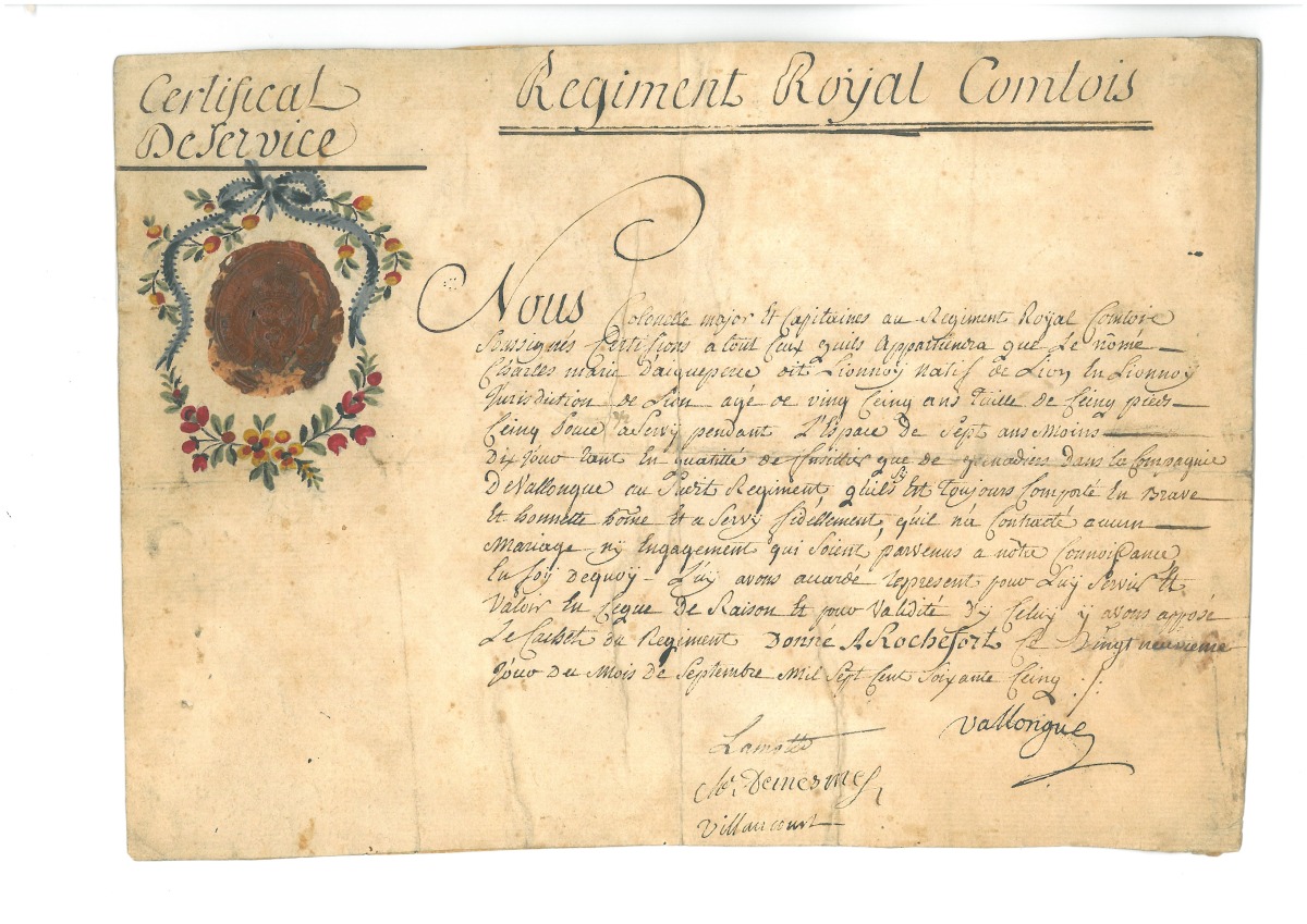Certificat de service décerné à un fusilier grenadier d'une des compagnies du régiment royal Comtois, " sy est toujours comporté en brave et honneste homme et a servy fidellement, qu'il n'a contracté aucun mariage ny engagement qui soient parvenus à notre connaissance ", donné à Rochefort le 29 septembre 1765, signé par marc Antoine Renaud sieur de VALLONGUE, capitaine de grenadiers. Cachet de cire entouré d'un décor floral aquarellé. 18 x 25 cm.