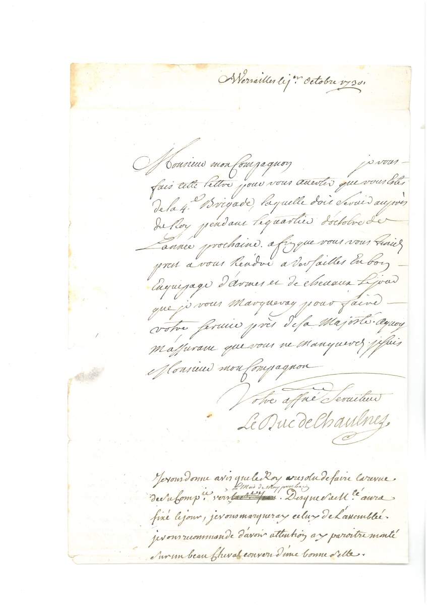 Joint : L.S. avec annotation manuscrite de Louis-Auguste d'Albert d'Ailly, duc de CHAULNES (1676-1744), lieutenant-général des armées du roi, à l'adresse du chevalier de Villepail, Versailles, 1er octobre 1730, 1 page in-4. Convocation pour le service des armées du roi : " Je vous donne avis que le Roy a résolu de faire la revue de sa compagnie vers le mois de may prochain (