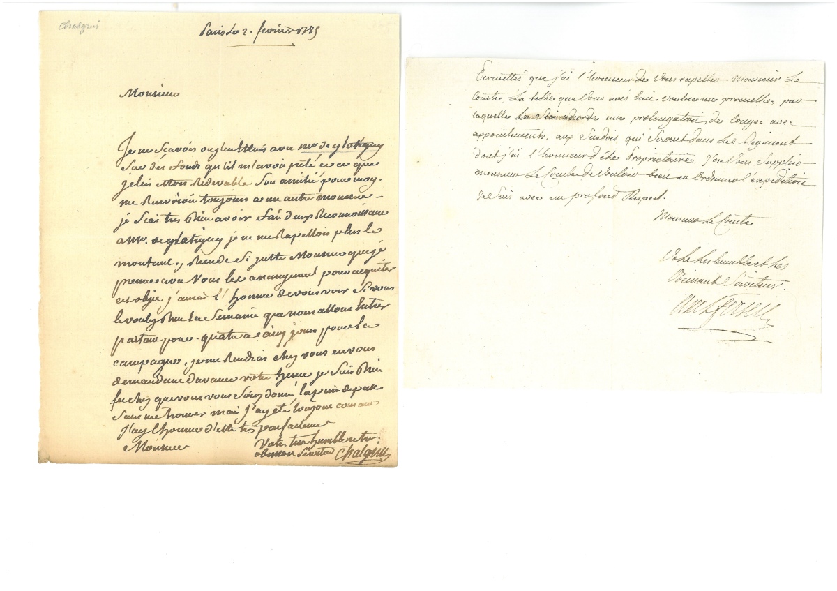 L.A.S. à un comte [ministre de la guerre ?], page petit in-4. Il réclame la lettre " par laquelle le Roi accorde une prolongation de congé avec appointements aux Suédois qui seront dans le Regiment dont j'ai l'honneur d'être propriétaire… "