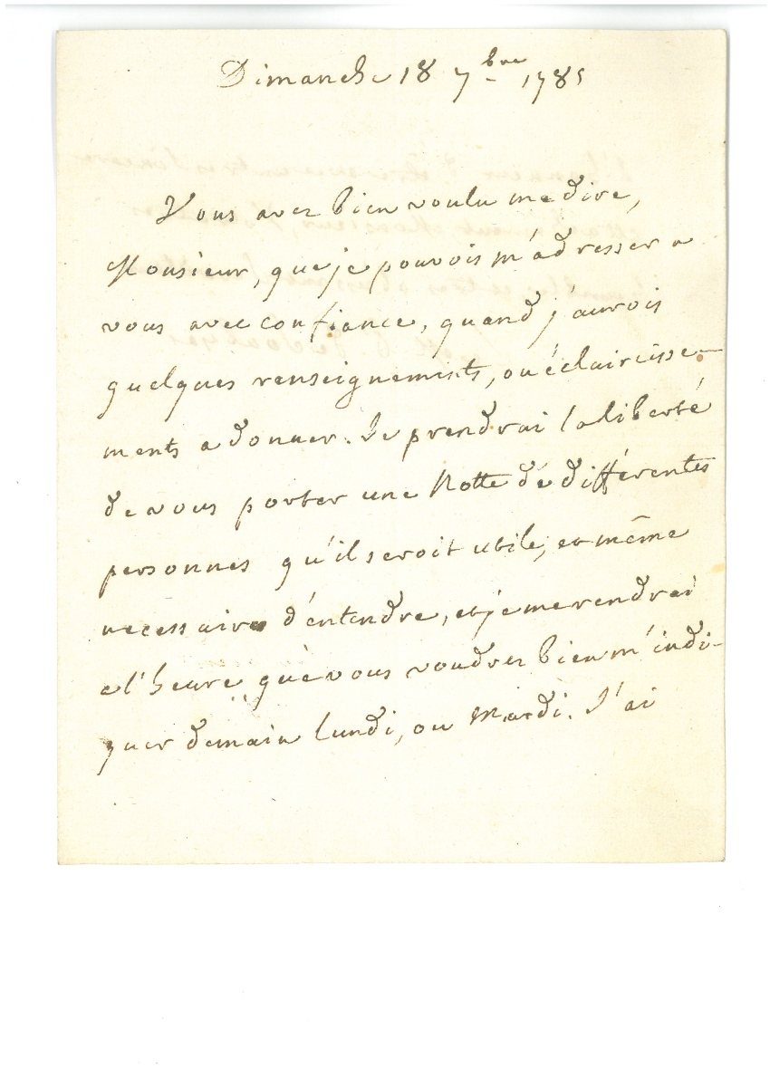 " - L.A.S. de Charles de ROHAN, prince de Soubise (1715-1787), maréchal de France, 18 septembre 1785, 1 page ½ in-8. Texte qui écho à l'affaire du collier de la Reine Marie-Antoinette : " Vous avez bien voulu me dire, Monsieur, que je pouvais m'adresser à vous avec confiance, quand j'aurais quelques renseignements ou éclaircissements à donner. Je prendrai la liberté de vous porter une note de différentes personnes qu'il serait utile d'entendre et je me rendrai à l'heure que vous voudrez bien m'indiquer demain lundi ou mardi
