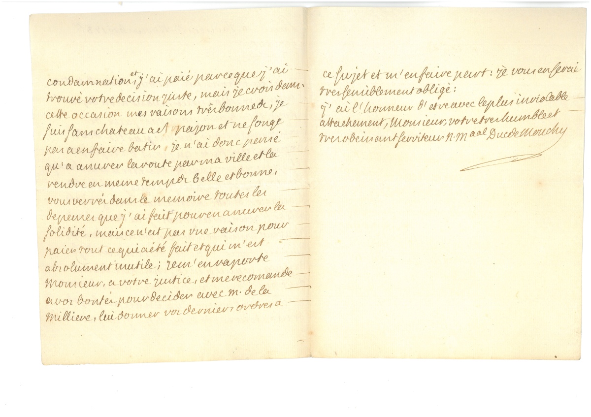 L.A.S. de Philippe de NOAILLES, duc de Mouchy (1715-1794), Grand d'Espagne et maréchal de France, époux d'Anne Claude d'Arpajon, Paris, 15 novembre 1785, 2 pages ½ in-8 : " J'ai eu l'honneur de vous remettre un mémoire, Monsieur, avant mon départ pour Bordeaux pour vous faire des représentations sur une partie des réparations faites au pont d'Arpajon, et que je ne crois pas être à ma charge surtout après les sacrifices que j'ai fait à l'occasion de cette construction dont j'ai été obligé d'avancer les fonds (