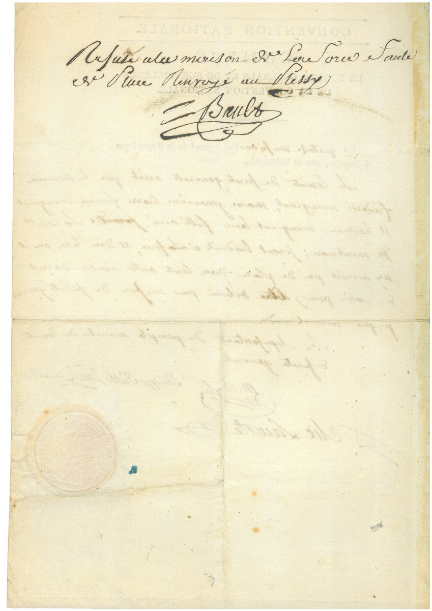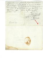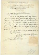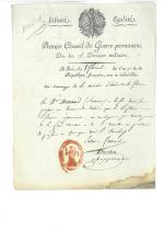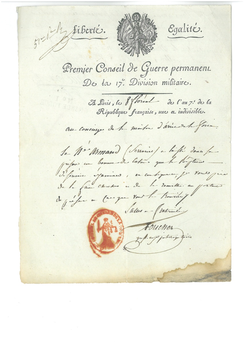 " [Promu général de brigade provisoire dans l'armée de Moselle le 5 septembre 1793, il est blessé lors de la bataille de Pirmasens le 14 septembre 1793, au cours de laquelle les Français perdent le combat face aux troupes prussiennes et de Brunswick. Il est envoyé à Paris le 26 septembre suivant pour faire son rapport sur cette défaite. Il est arrêté le 6 octobre 1793 et destitué.] - P.S. par les membres du comité de sûreté générale, 14 messidor an II (2 juillet 1794), 1 page in-fol., en-tête " Convention Nationale, Comité de Sureté Générale et de Surveillance de la Convention nationale ", cachet cire sous papier. Ordre d'arrestation et d'amener à la prison de la Force, signé par les conventionnels Jacques-Philippe RÜHL, Moïse BAYLE, Elie LACOSTE et LOUIS du BAS-RHIN. Signature au dos de " BAULT " concierge de la prison de la Force. - P.S. par le greffier aux interrogatoires du " Premier Conseil de guerre permanent ", 8 floréal an VII (27 avril 1799), adressée " au concierge de la maison d'arrêt de la Force ", cachet encre noir au verso " N°I GRANDE FORCE ".