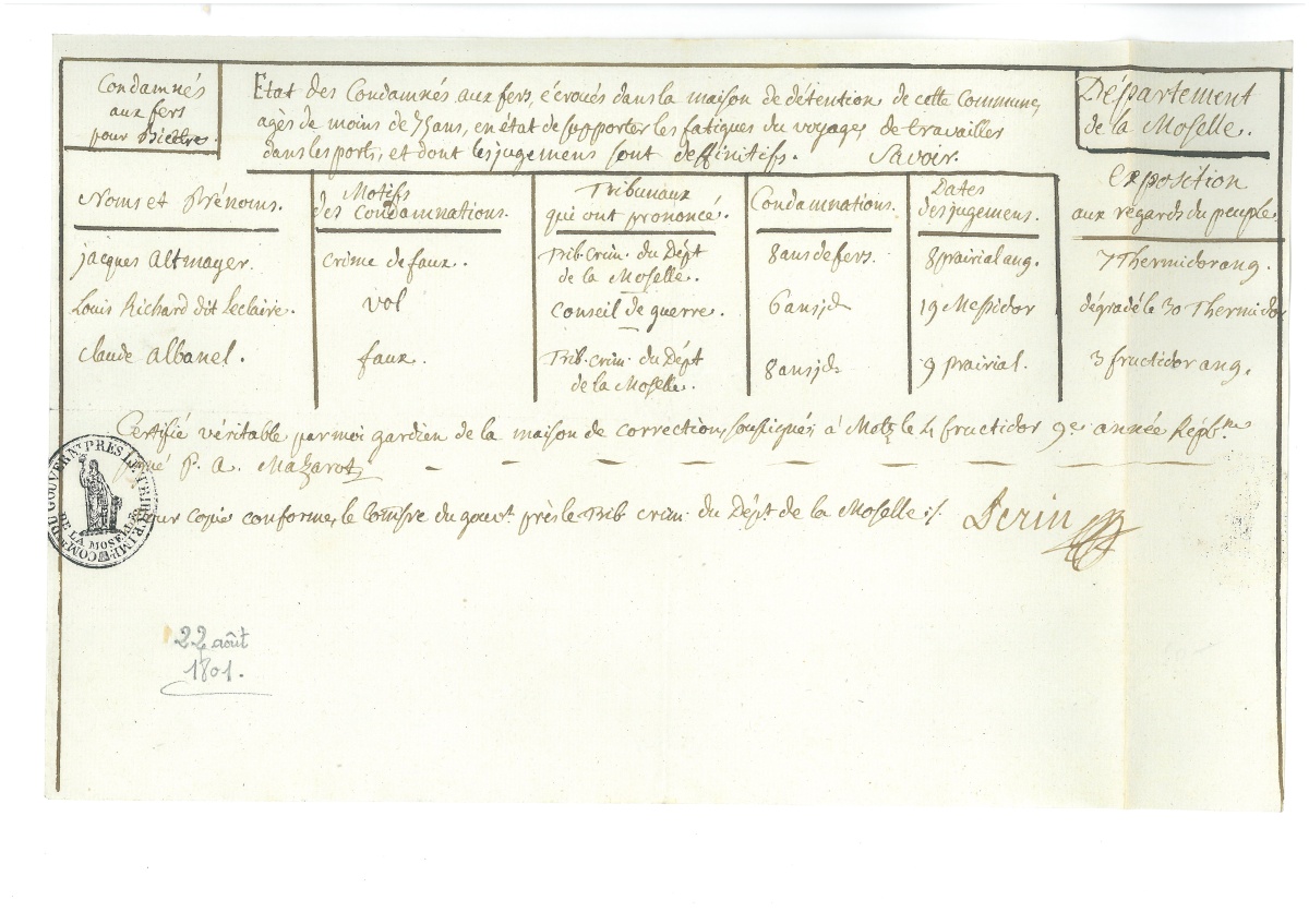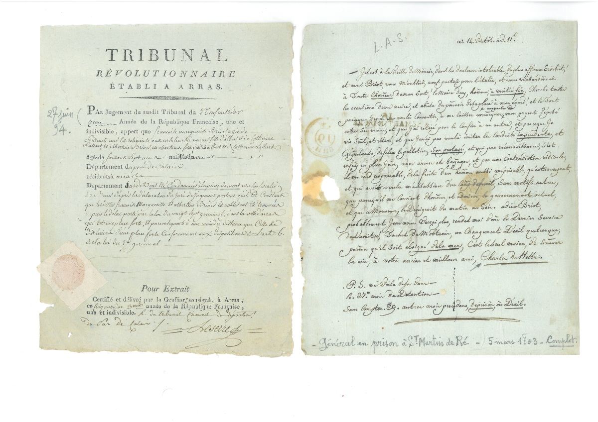 " - P.S. en partie impr. du " Tribunal révolutionnaire établi à Arras ", 9 messidor an II (27 juin 1794), 2 condamnations à mort - L.A.S. de Jean DUPLESSI-BERTAUX (1747-1819), dessinateur et graveur, écrite de prison, 19 thermidor an II (6 août 1794), à sa femme - L.A.S. d'un détenu au bagne de Toulon, 27 floréal an V (16 mai 1797) - L.A.S. de l'accusateur public du département de la Haute-Loire, 12 messidor an VI (30 juin 1798), au sujet de l'arrestation des membres des " compagnies connues à Lyon sous les noms de Jésus et du Solice " - L.A.S. d'un détenu de la prison de Châlons-sur-Saône, 15 fructidor an VII (29 août 1799) - P.S. " Etat des médicaments fournis aux détenus de la maison d'arrêt de la commune de Falaise " (Calvados), 21 brumaire an VIII (12 nov. 1799) - P.S. " Etat des condamnés aux fers écroués dans la maison de détention " de la commune de Metz, 4 fructidor an IX (22 août 1801) - L.A.S. du prince Charles de HESSE-RHEINFELS-ROTENBURG (1752-1821), général au service de la France, déporté à Saint Martin de Ré, 14 ventôse an XI (5 mars 1803) : " Je suis à la veille de mourir, dans les douleurs intolérables, du plus affreux scorbut, et vous Briot, vous m'oubliez, vous partez pour l'Italie, et vous m'abandonnez à toute l'horreur de mon sort, le maire d'icy, homme à moitié fou cherche toutes les occasions de me nuire