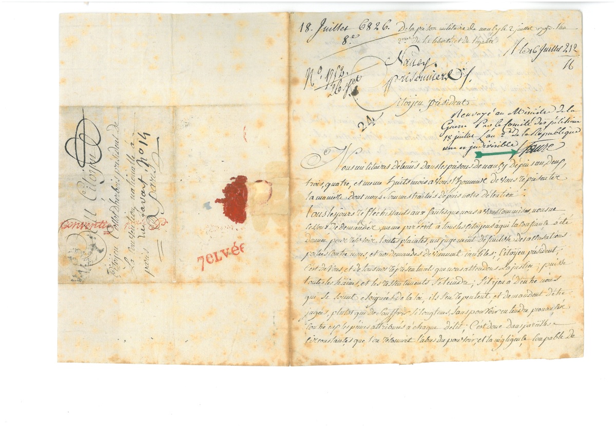 L.A.S. adressée à un détenu de la prison de Besançon, 6 janvier 1793 - L.A.S. par 8 militaires détenus en la prison militaire de Nancy adressée à Collot d'herbois président de la Convention nationale, 2 juillet 1793, griffe rouge " Convention Nale P " - L.A.S. de Bernard Thomas TRÉHOUART (1754-1804), député d'Ille-et-Vilaine sous la Convention, de la prison de Janville, 13 nivôse an II (2 janvier 1794), adressée au président de la Convention nationale : " Citoyen président (