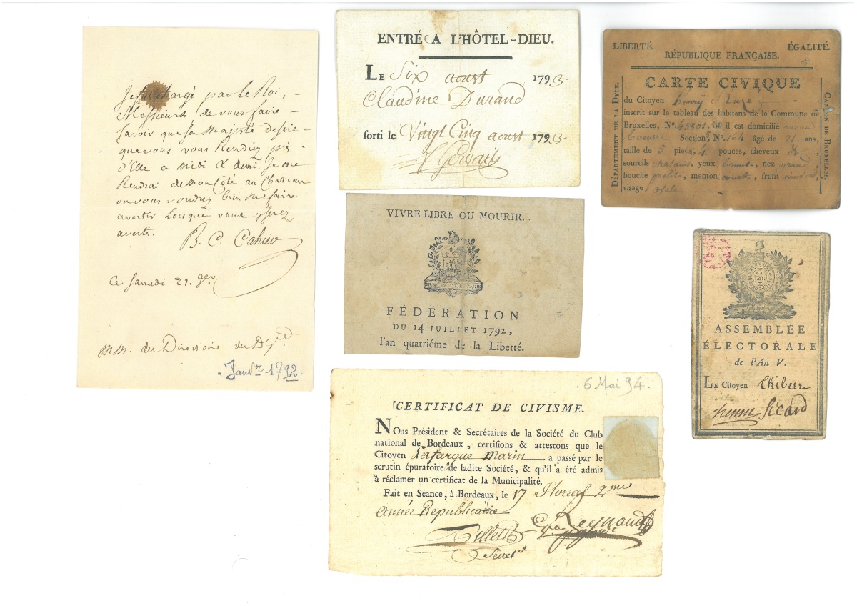 " - Carte de fédéré de 1792, impr., 11,5 x 8 cm - Billet d'entrée à l'Hôtel-Dieu, 6 août 793 - L.S. de la commune nommée " Bedouin l'Infâme " (Vaucluse), 1794 - L.A.S. décrite de Marseille, 1794, en exergue : " Comune sans nom, cydevant Marseille " - Certificat de civisme délivré par la société du club national de Bordeaux, 17 floréal an II (4 mai 1794) avec attestation de civisme - P.S. de l'hôpital général de la Salpêtrière, 1795 - L.A.S. signée par Claude Alexandre YSABEAU, député conventionnel et par les membres du comité de sûreté générale, 24 prairial an III (12 juin 1795), donnant des directives dans la préparation du jugement des députés Montagnards arrêtés lors de l'insurrection de prairial. - Carte d'électeur de l'an V (mars-avril 1797) - Carte civique délivrée par le canton de Bruxelles, 18 pluviôse an VI (6 février 1798) - P.A.S. de Jean Michel MOREAU le jeune (1741-1814), illustrateur et graveur, Paris 1er thermidor an VI (19 juillet 1798), quittance de paiement délivrée à l'éditeur Renouard " pour le payement des quarante huit dessins que j'ai fait pour édition de Gessner