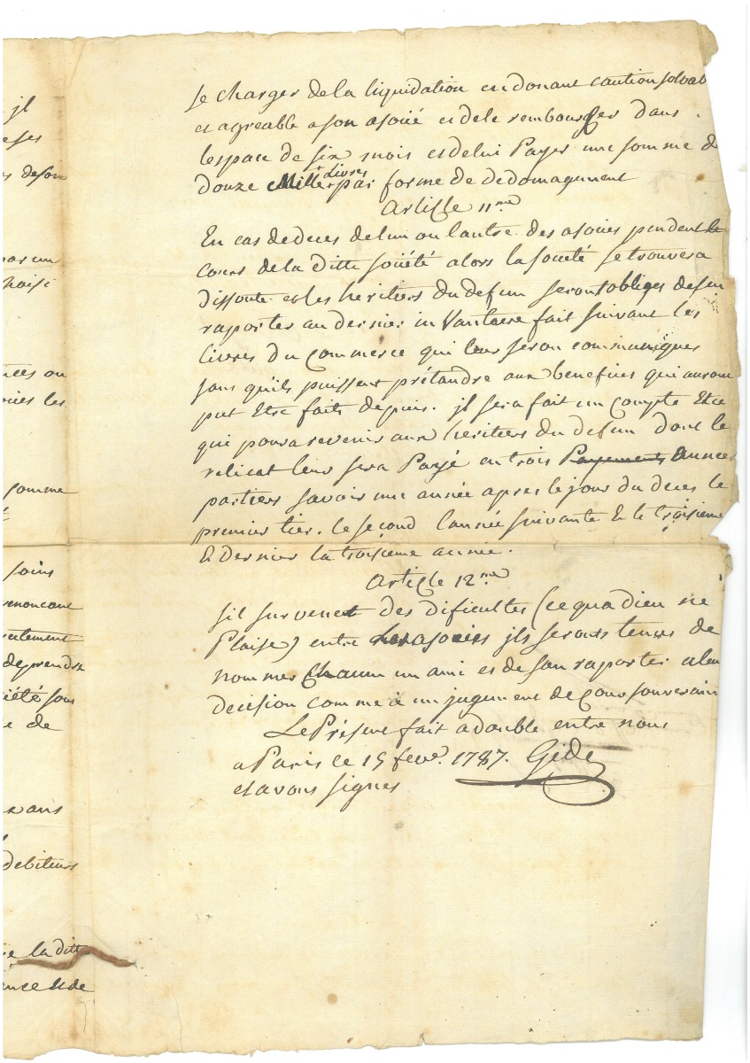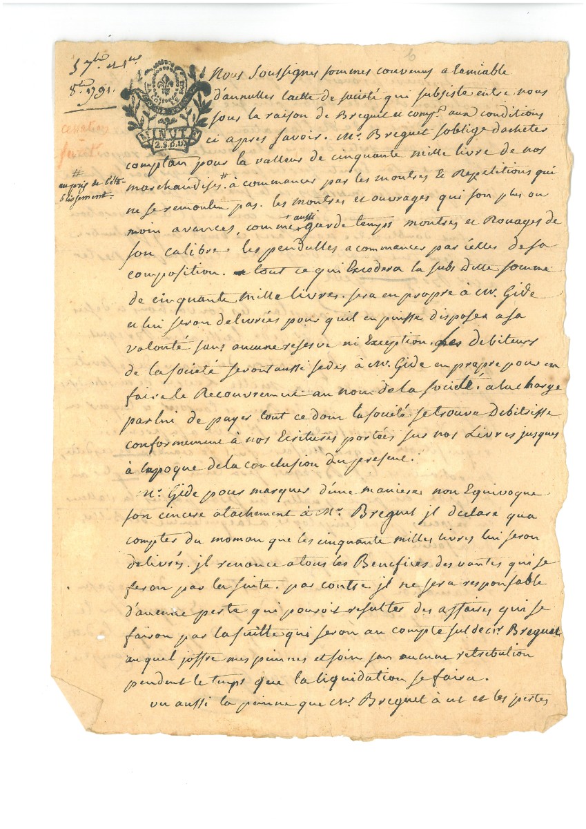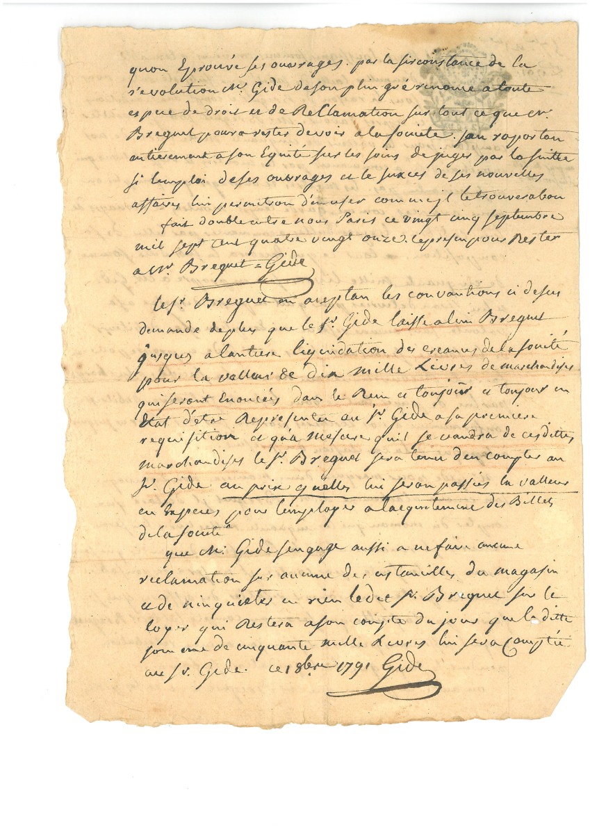 - Acte de dissolution de société écrit et signé par GIDE, daté du 1er octobre 1791, 2 pages in-4, " Nous sommes convenus à l'amiable d'annuler l'acte de société qui subsiste entre nous sous la raison de Breguet et compagnie aux conditions ci-après