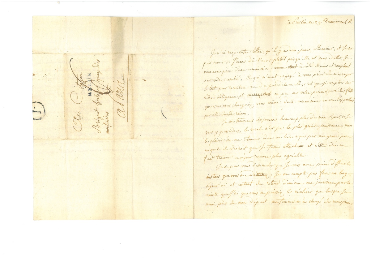 ) je vous avez prié d'une commission comme étant à côté de vous et comptant sur votre amitié. Ce qui m'avait engagé à vous prier de m'envoyer le tout par la voiture rue du pas de la mule ; c'est que je comptais sur votre obligeance, et un peu sur votre paresse et je 'm'étais flatté que vous vous chargeriez vous-même de la commission en me l'apportant par cette double raison. Je me trouverais et je jouirais beaucoup plus de mon séjour, si je vous y possédais, le rural n'est pas la plus grande jouissance, (