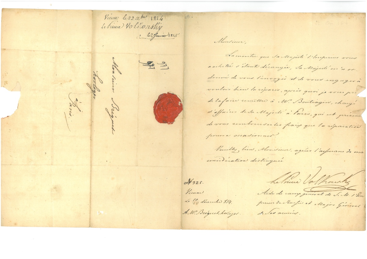 - L.S. du prince Nicolas VOLKONSKI (1753-1821), aide de camp général d'Alexandre 1er, empereur de Russie, Vienne, 10 décembre 1814, 1 page in-4 : " La montre que Sa majesté l'Empereur vous achetée s'étant dérangée, Sa Majesté m'a ordonné de vous l'envoyer et vous engager à vouloir bien la réparer