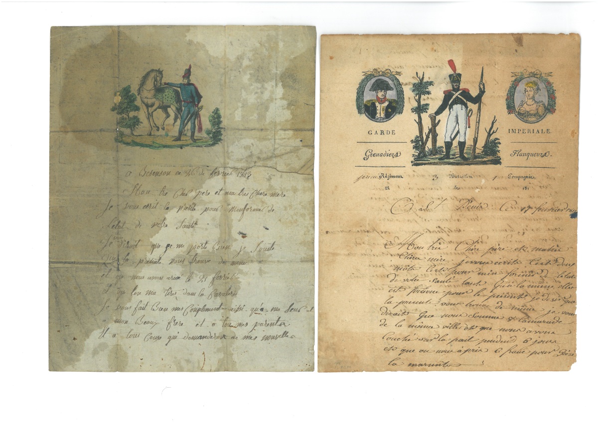 " - Rare L.A.S. de François GORON " grenadier flencoeur au 3e bataillon, 1ere compagnie à la caserne de Saint Denis proche Paris ", 13 février 1811, adressée à ses parents à Avranches, 2 pages in-4, bel en-tête à vignette gravée et coloriée représentant un grenadier flanqueur de la garde impériale, entourée de deux médaillons gravés et coloriés de Napoléon et Marie-Louise : " (