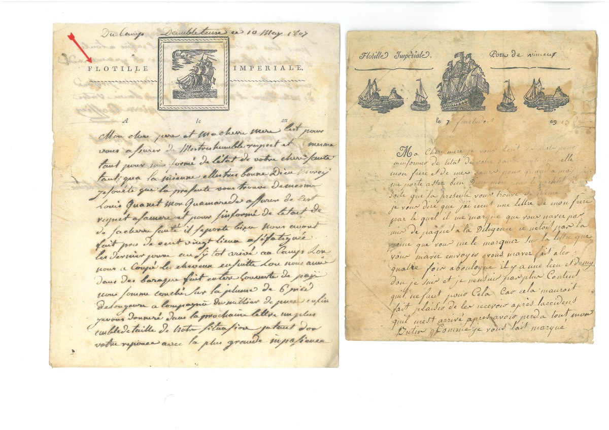 " - L.A.S. de Pierre BOSSIER, soldat dans la 1ère compagnie du 4e bataillon du 17e régiment d'infanterie de ligne, au camp d'Ambleteuse près Boulogne sur Mer, 10 mai 1807, en-tête avec vignette gravée représentant un navire (signée Besnard) et inscription " Flotille impériale ", adressée à ses parents au Lude, 1 page ¼ in-4 : " (