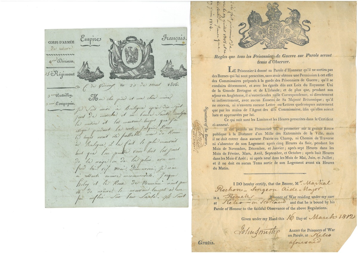 " - P.S. par des officiers anglais, Kelio en Ecosse, 16 mars 1812, 1 page in-fol., impr. et partie manuscrite, belle vignette, ayant pour titre " Règles que tous les prisonniers de guerre sur parole seront tenus d'observer ". Parole sur l'honneur d'un chirurgien des armées de Napoléon emprisonné en Grande-Bretagne. -