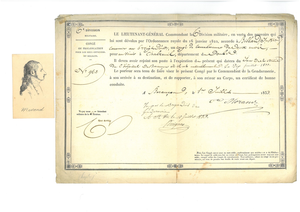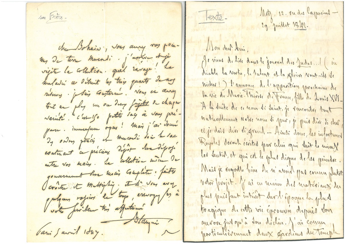 Petit calendrier de 1830 découpé, 1 page in-8 obl. Comportant les signes du zodiaque, jour, date et fêtes. - L.S. de Pierre Marie TAILLEPIED de BONDY (1766-1847), préfet, Paris, 25 avril 1831. - L.A.S. de Marie Adélaïde LENORMAND (1772-1843), la célbre voyante, amie de Joséphine de Beauharnais, 3 pages in-12. Au sujet de sa brochure en faveur de la duchesse de Berry : " Veuillez bien monsieur jetez un coup d'œil scrutateur sur ces trois feuilles d'épreuves (…) j'ai beau vouloir nuancée mes couleurs, en affaiblir les teintes ; mon génie commande : n'importe le danger ! Im me faut obéir ? Nous sommes dans un siècle où les femmes ne sont pas chose facile à gouverner… en fait nous verrons ce qu'il adviendra ! en attendant de vivre de Persil, corrigeons nos épreuves (…) ce me serait une chose de grande déplaisance de devenir avant peu sa très proche voisine, non à Londres, mais dans la bonne ville de Paris, quartier Saint Lazare dans la prison item… et ce pour avoir nonobstant bons conseils voire même sinistres prédications, m'être arrogée le droit de publier mainte brochure légitimiste à l'effet de défendre madame la duchesse de Berry et son fils… " [Elle publie en 1833 : Arrêt suprême des dieux de l'Olympe en faveur de Mme la duchesse de Berry et de son fils.] - L.A.S. de FRANÇOIS Ier d'Autriche (1768-1835), empereur d'Autriche, Baden, 1er août 1832, au comte Hartmann, 1 page in-4, en allemand. Lui décerne la croix de commandeur de l'ordre de l'Empereur Léopold pour ses mérites qu'il a déployés lors de son service auprès de son cher petit-fils, le duc de REICHSTADT. [Le duc de Reichstadt décède le 22 juillet 1832 à Schönnbrunn, le comte Hartmann était son officier d'ordonnance.] - Billet de convocation de la garde nationale de Pruillé, 29 nov. 1832, vignette - L.A.S. d'un soldat, " fait au rad à Toulon, le 11 may 1833 ", embarqué à bord de la frégate La Bellone, en partance pour Ancône, adressée à ses parents, 3 pages in-4, ornée d'un beau dessin à l'encre, gouache et aquarelle, représentant un fusilier debout appuyé sur son fusil scrutant au large un trois-mâts arborant le drapeau français. - Congé de convalescence délivré à un canonnier au 6e régiment d'artillerie, Besançon, 1er juillet 1833, signé par Charles Antoine Louis Alexis MORAND (1771-1835), général. - L.A.S. d'Augusta Amélie de BAVIERE (1788-1851) épouse du prince Eugène de Beauharnais, au château d'Ismaning à Bade, 1er nov. 1838, 2 pages in-4, ornée d'un petit bouquet de fleurs : " Ayant communiqué votre lettre à ceux de mes enfants qui contribuent à la pension du marquis de Beauharnais, savoir le prince Max, la princesse de Hohenzollern, l'Impératrice douairière du Brésil et la princesse Théodolinda, je n'ai pu y répondre plus tôt. Mes enfants ne peuvent pas prendre l'engagement de continuer à Melle de Beauharnais une partie de la pension du marquis (…) mais ils donneront 4000 francs chacun le jour où Melle Hortense se mariera… ". - P.S. de Régis de Keredern de TROBRIAND (1816-1897), général, Limoges, 20 janvier 1841, autorisation de mariage délivrée à un soldat. - L.A.S. de Charles Ferdinand GAMBON (1820-1887), républicain antiroyaliste, 9 juillet 1841, 2 pages ½ in-8 - Pièce imprimée de présentation des vœux du tambour de la 4e compagnie de chasseurs, ornée d'une grande vignette lithographiée à la gloire du pouvoir en place. - L.A.S. d'Alcide du Bois de BEAUCHESNE (1804-1873), archiviste et auteur, Metz, 29 juillet 1842, 3 pages in-8, adressée à Alfred Nettement, journaliste légitimiste : " Je viens de lire dans le journal des Judas… ! (où diable la vertu, le talent, et la gloire vont-ils se nicher !) l'annonce de l'apparition prochaine de la vie de Marie Thérèse de France, fille de Louis XVI. (…) Mais je regrette bien de n'avoir pas connu plutôt votre projet ! J'ai en main des matériaux du plus puissant intérêt sur l'époque la plus tragique de cette vie éprouvée depuis son aurore jusqu'à son déclin. J'ai connu particulièrement deux gardiens du Temple qui voyaient tous les jours Madame Royale. J'ai puisé à pleines mains dans la mémoire encore jeune de ces deux vieillards. J'ai fouillé pendant de longues années dans les décombres du Temple, et vous ne sauriez croire tout ce que j'y ai trouvé de choses touchantes et encore inconnues. Et puis je suis propriétaire de vers composés par S.A.R. dans la tour du Temple et écrits de sa main. J'ai de sa main aussi son itinéraire depuis sa sortie de prison jusqu'à la frontière. Je vous dirai un jour comment ces pieuses reliques m'ont été léguées (…) depuis longtemps je songe à une histoire des Tours du Temple pendant la Révolution, et à une histoire de Louis XVII, dont j'ai pu, jour par jour, heure par heure, enregistrer la longue et cruelle agonie… " -