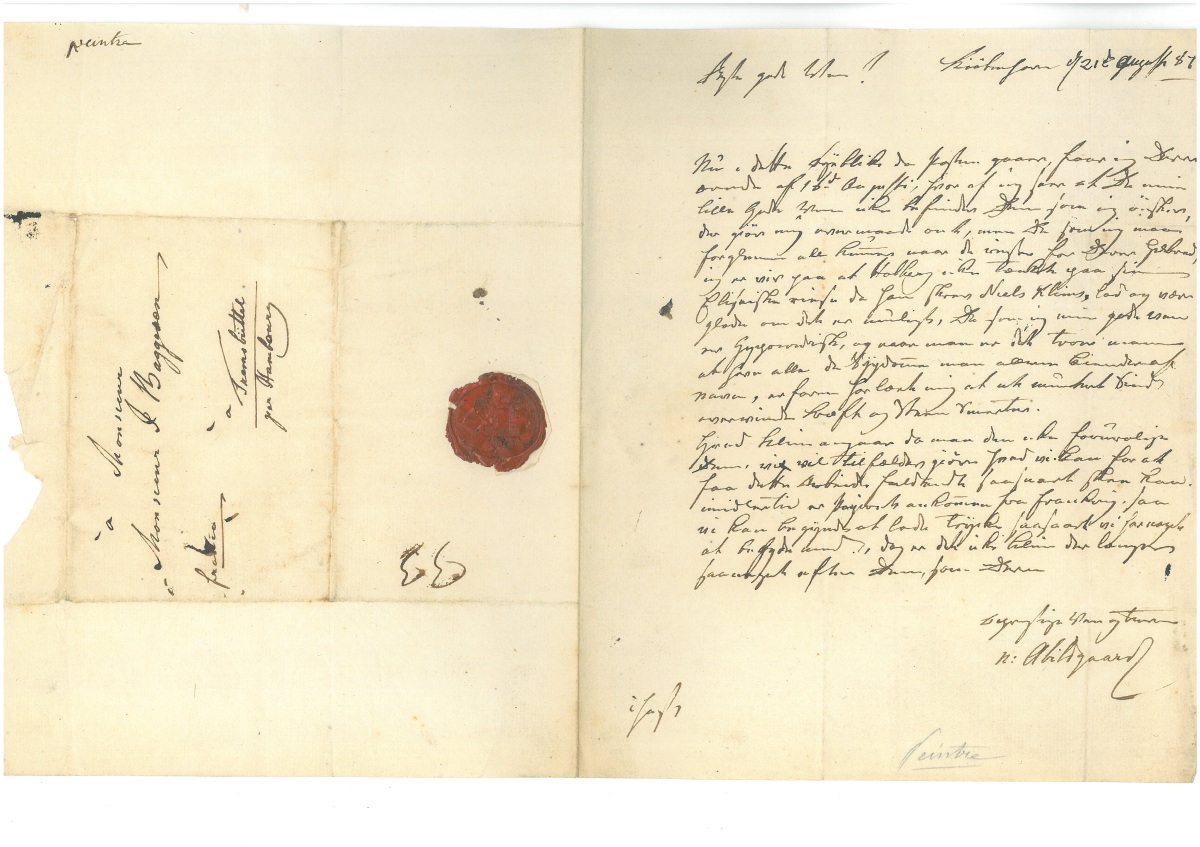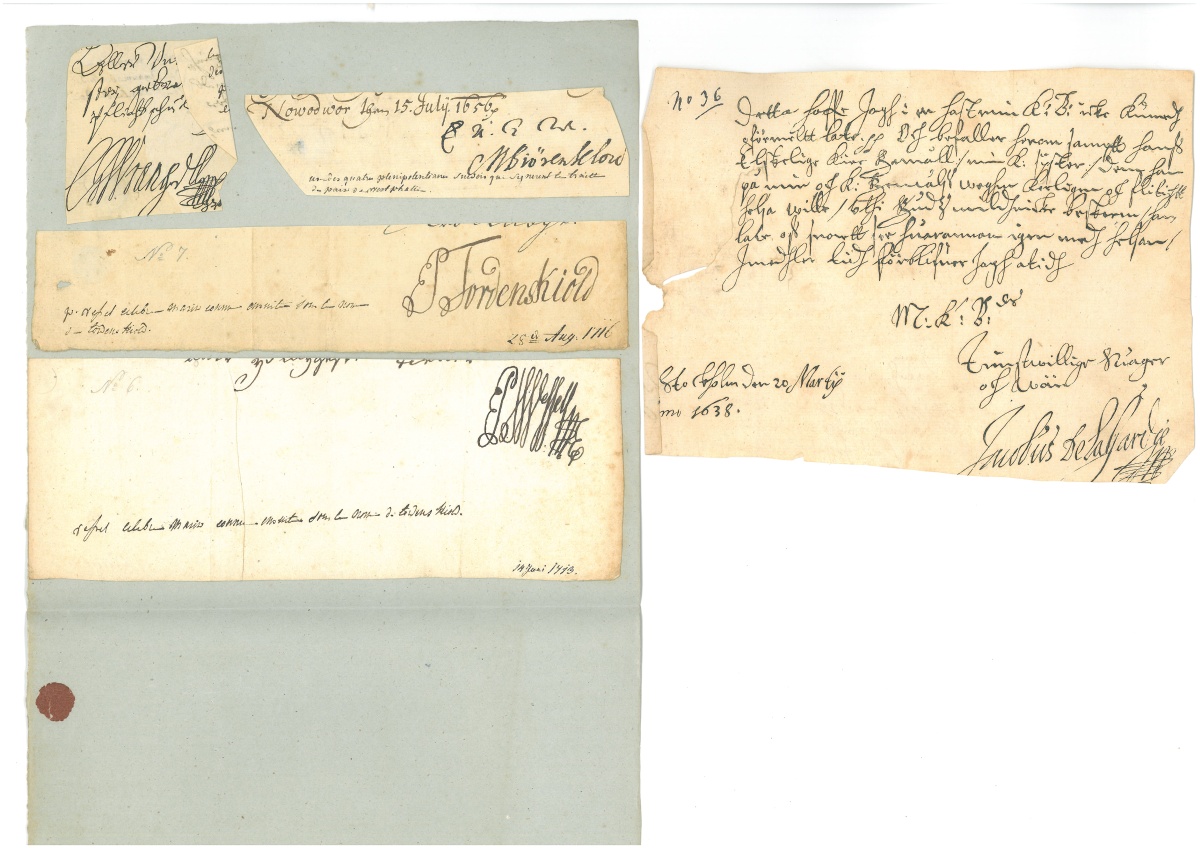 L.A.S. de Nicolaï Abraham ABILDGAARD (1743-1809), architecte, peintre, dessinateur et décorateur danois, août 1787, 1 page in-4, texte en danois, adressée à Jens Immanuel Baggesen (1764-1836) poète danois à Hambourg, superbe cachet de cire rouge [Très actif pendant la période entre 1777 et 1794, Abildgaard reçoit de lucratives commandes de la monarchie danoise puisqu'il est nommé peintre historique du roi vers 1780. Il joue alors un rôle important dans le développement du courant néoclassique au Danemark. Dès 1778, il enseigne également à l'Académie royale des beaux-arts du Danemark à Copenhague, où il est élu président de 1789 à 1791.] - P.S. de Jacob II de la GARDIE (1583-1652), libre baron du royaume de Suède, sénateur, grand connétable de Suède, Stockholm, 20 mars 1638, 1 page obl. in-8 - 6 pièces portant les signatures manuscrites d'hommes d'état du royaume du Danemark, XVIIe et XVIIIe siècles.