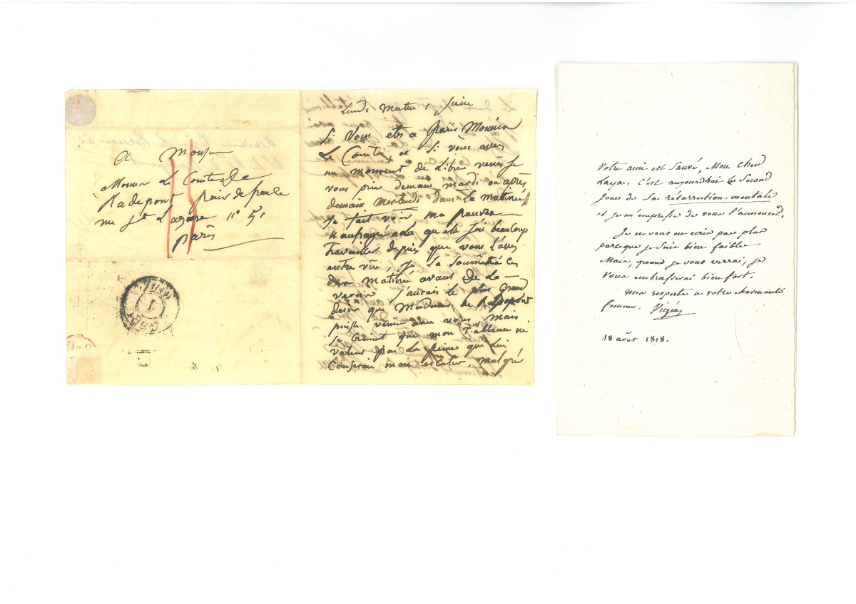 L.A.S., 18 août 1818, 1 page in-8, adressée à M. Laya à l'académie française : " Votre ami est sauvé, mon cher Laya. C'est aujourd'hui le second jour de sa résurrection mentale et je m'empresse de vous l'annoncer. Je ne vous en écris pas plus parce que je suis bien faible. Mais, quand je vous verrai, je vous embrasserai bien fort