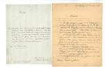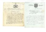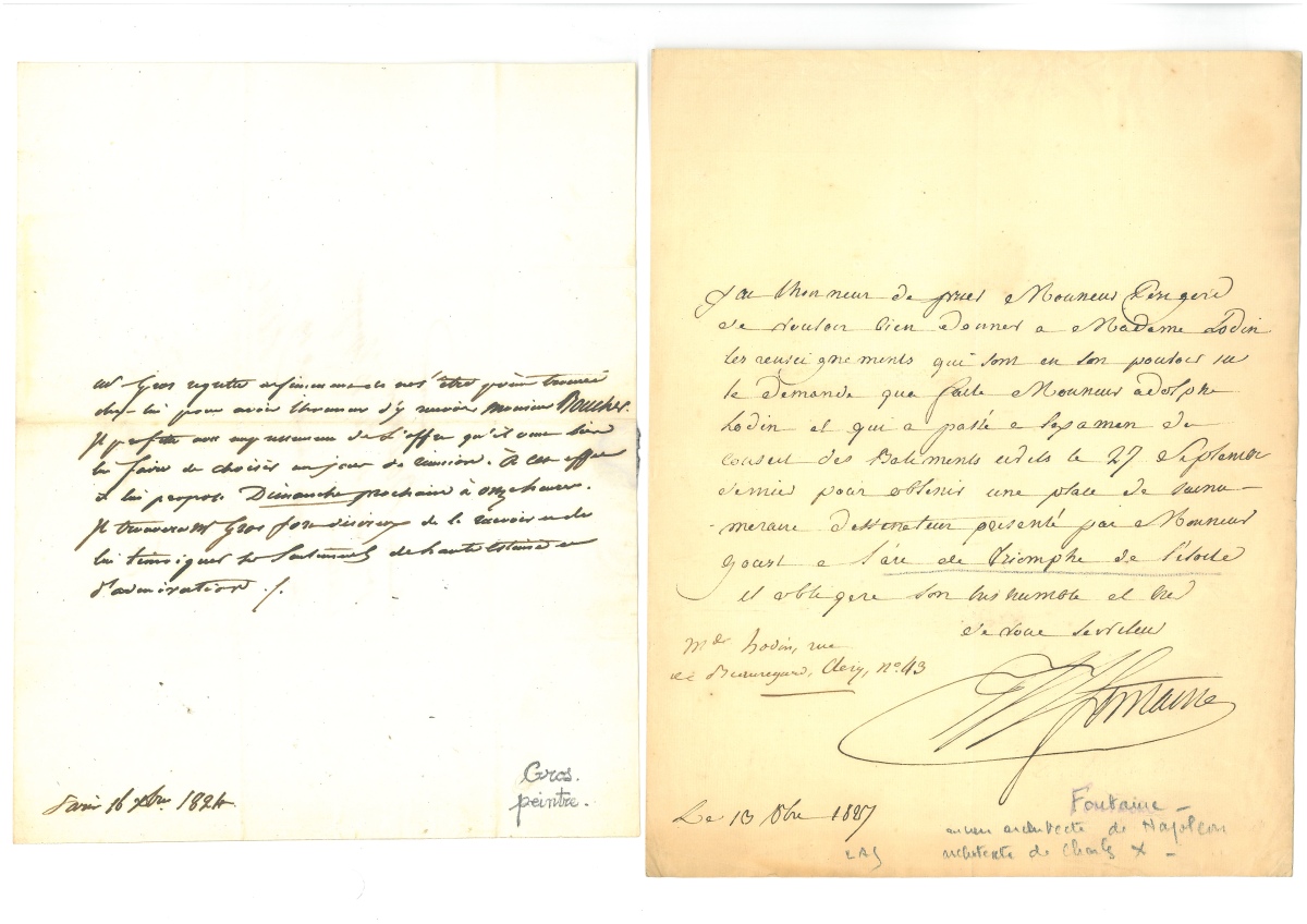 ". - L.A.S. de Pierre Alexandre VIGNON (1763-1828), architecte néoclassique, Paris, 17 mai 1806, 1 page in-4, adressée à un marchand de fond, étant intéressé pour l'achat d'un château sur la terre de Chessi ; joint impr. " P. Vignon architecte à la Convention nationale sur la nouvelle salle dans le palais des Tuileries " (incomplet) - L.A. d'Antoine GROS (1771-1835), peintre, Paris, 16 déc. 1824, à M. Boucher, premier violon du roi d'Espagne, demi page in-4. Il regrette de ne pas s'être trouvé chez lui pour recevoir M. Boucher et propose à celui-ci de revenir dimanche à onze heures. - L.A. de Robert LEFEVRE (1755-1830), peintre, fin 1827, demi page in-4. Brouillon de sa réponse à la suite d'une L.S. des administrateurs des Bains de Marie-Thérèse de la Rochelle du 15 déc. 1827. Il les remercie pour leurs félicitations au sujet du portrait de S.A.R. Madame la Dauphine que le Roi a accordé à l'établissement des bains de la Rochelle : " Je m'y suis surpassé. J'y ai fait du moins mes efforts. Lorsqu'il s'agit de donner une idée de la majesté nie aux vertus les plus éminentes un cur français (