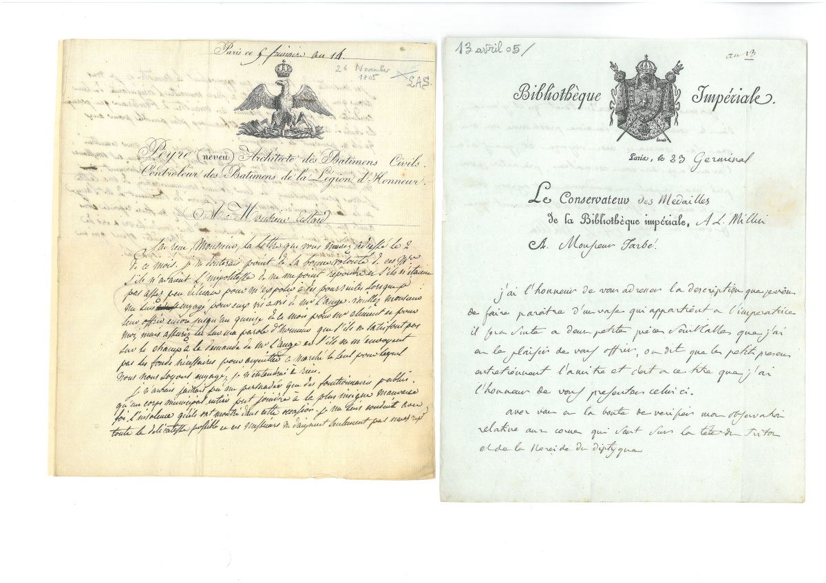 " ; Paris, 14 sept. 1833, à l'architecte Lebas au sujet d'une visite de son atelier avec Visconti. Joint L.A.S. de M. de Lourdoueix, 10 février 1825, relative à la pension de Jacquotot. - L.A.S. de Pierre François FONTAINE (1762-1853), architecte et décorateur de Napoléon Ier et de Charles X, 13 déc. 1827, 1 page in-4 - L.A.S. d'André GALLE (161-1844), graveur, 20 brumaire an XII (12 nov. 1803), 1 page in-8 - L.S. de Nicolas Pierre TIOLIER (1784-1843), graveur et médailleur de la monnaie de Paris, 22 février 1809, 1 page in-fol. - L.A.S. de François Joseph BOSIO (1768-1845), sculpteur, au peintre François Joseph Heim, 2 pages in-8. Il n'est pas encore suffisamment rétabli pour supporter les fatigues du jury : " (