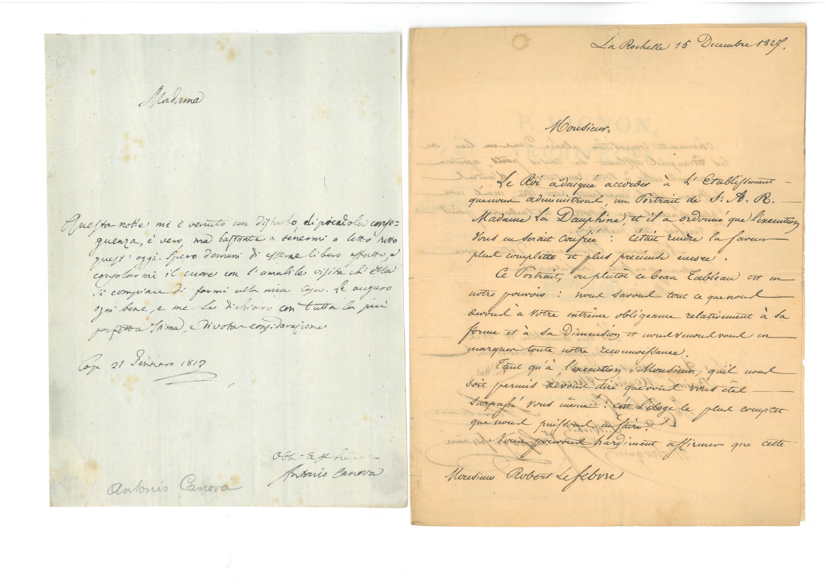 " ; 18 mai 1825 : " Madame la baronne de Marguerite veut elle bien, en agréant mes civilités empressées que je lui rappelle la promesse qu'elle m'a faite de venir voir mon tableau de la Corine terminée, ainsi que le portrait d'Anne de Boulen d'après le fameux Holbein ?... " ; Paris, 2 avril 1829 : " Monsieur le duc, si vous le permettez j'aurai l'honneur de vous porter (