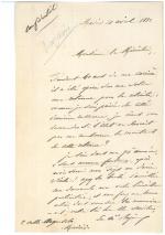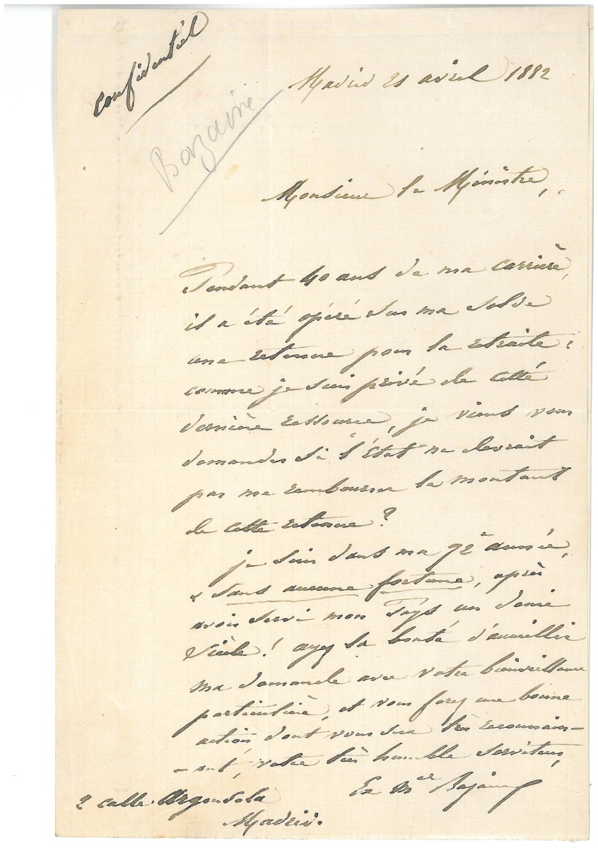 Joint : L.A.S. de François Achille BAZAINE (1811-1888), maréchal de France et commandant en chef de l'armée du Rhin, Madrid, 21 avril 1882, au ministre de la guerre : " Pendant 40 ans de ma carrière il a été opéré sur ma solde une retenue pour la retraite : comme je suis privée de cette dernière ressource, je viens vous demander si l'état ne devrait pas me rembourser le montant de cette retenue ? Je suis dans ma 72e année, sans aucune fortune, après avoir servi mon pays un demi-siècle !... ".