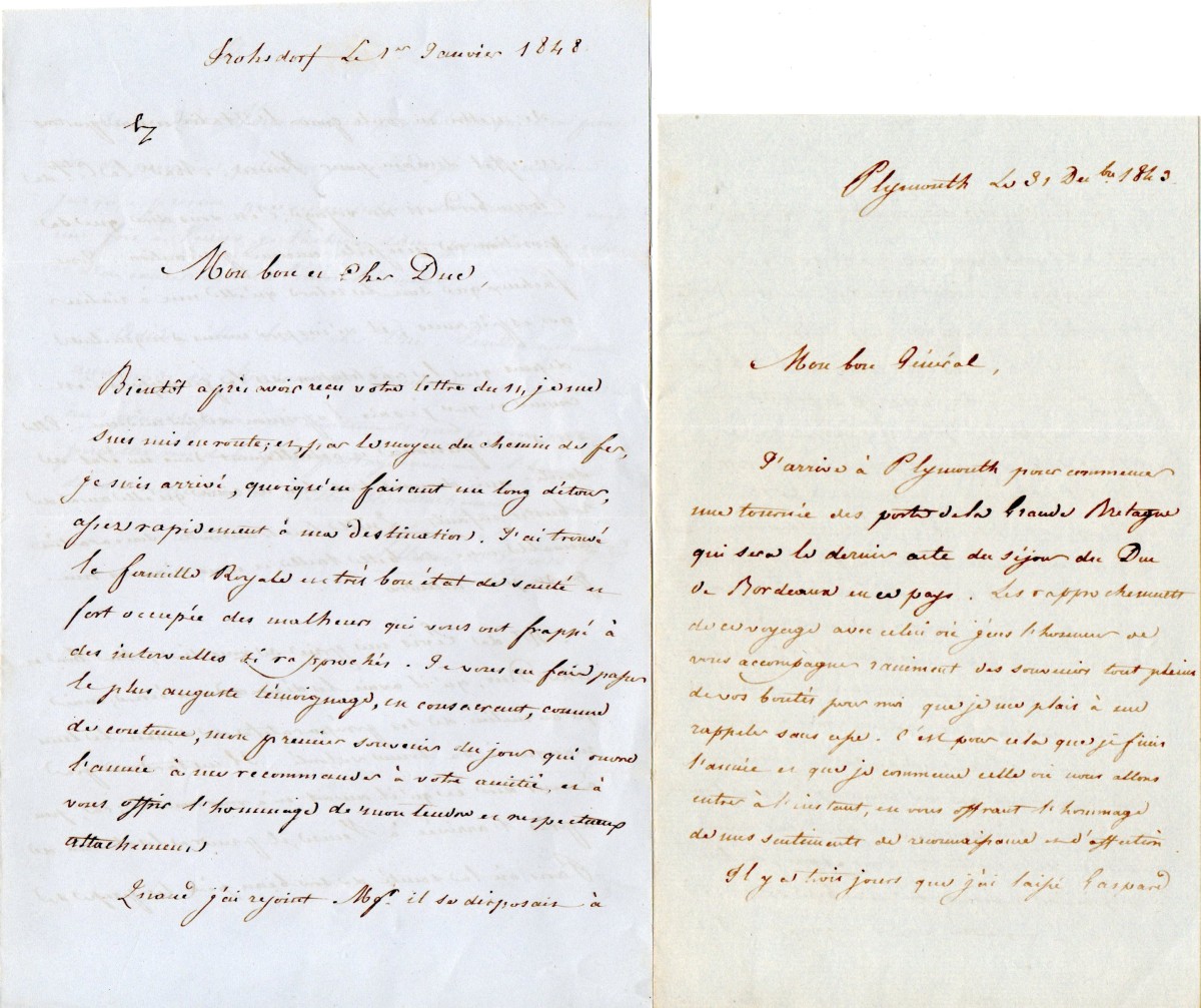 Plymouth, 31 décembre 1843 : " Mon bon général, j'arrive à Plymouth pour commencer une tournée des ports de la Grande-Bretagne qui sera le dernier acte du séjour du duc de Bordeaux en ce pays. (
